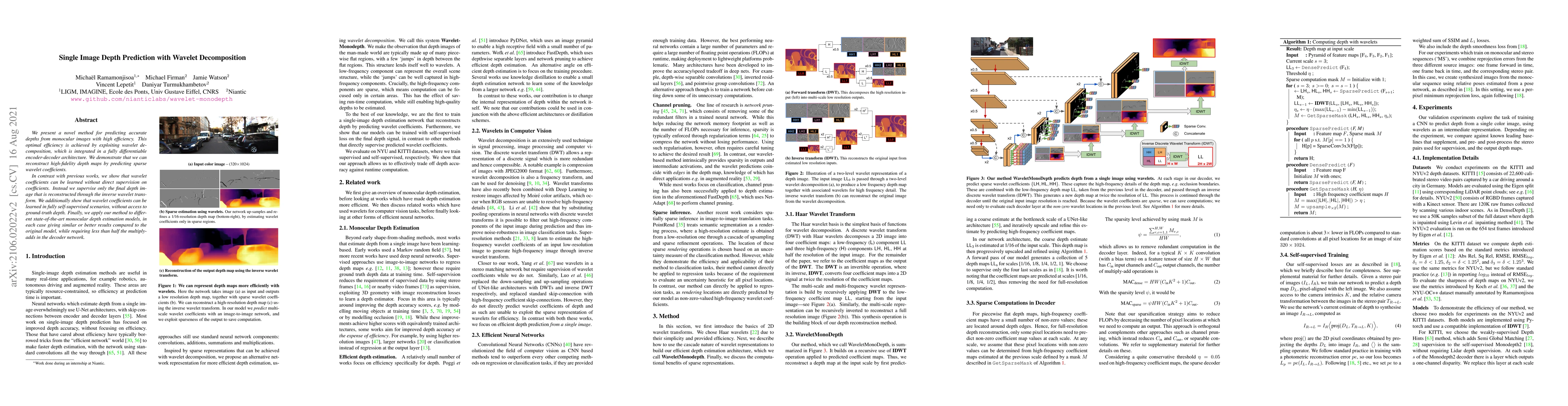 We present a novel method for predicting accurate depths from monocular images with high efficiency. This optimal efficiency is achieved by exploiting wavelet decomposition, which is integrated in a fully differentiable encoder-decoder architecture. We demonstrate that we can reconstruct high-fidelity depth maps by predicting sparse wavelet coefficients. In contrast with previous works, we show that wavelet coefficients can be learned without direct supervision on coefficients. Instead we supervise only the final depth image that is reconstructed through the inverse wavelet transform. We additionally show that wavelet coefficients can be learned in fully self-supervised scenarios, without access to ground-truth depth. Finally, we apply our method to different state-of-the-art monocular depth estimation models, in each case giving similar or better results compared to the original model, while requiring less than half the multiply-adds in the decoder network. Code at https://github.com/nianticlabs/wavelet-monodepth