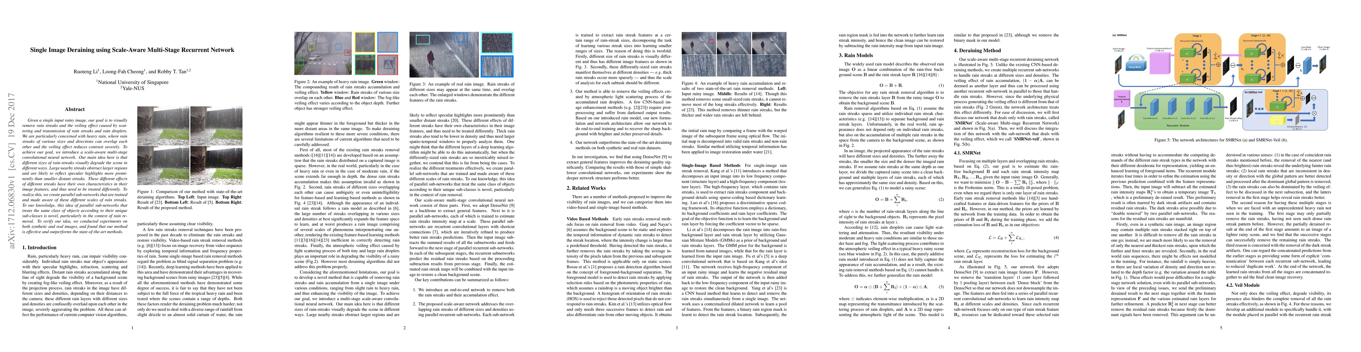 Given a single input rainy image, our goal is to visually remove rain streaks and the veiling effect caused by scattering and transmission of rain streaks and rain droplets. We are particularly concerned with heavy rain, where rain streaks of various sizes and directions can overlap each other and the veiling effect reduces contrast severely. To achieve our goal, we introduce a scale-aware multi-stage convolutional neural network. Our main idea here is that different sizes of rain-streaks visually degrade the scene in different ways. Large nearby streaks obstruct larger regions and are likely to reflect specular highlights more prominently than smaller distant streaks. These different effects of different streaks have their own characteristics in their image features, and thus need to be treated differently. To realize this, we create parallel sub-networks that are trained and made aware of these different scales of rain streaks. To our knowledge, this idea of parallel sub-networks that treats the same class of objects according to their unique sub-classes is novel, particularly in the context of rain removal. To verify our idea, we conducted experiments on both synthetic and real images, and found that our method is effective and outperforms the state-of-the-art methods.