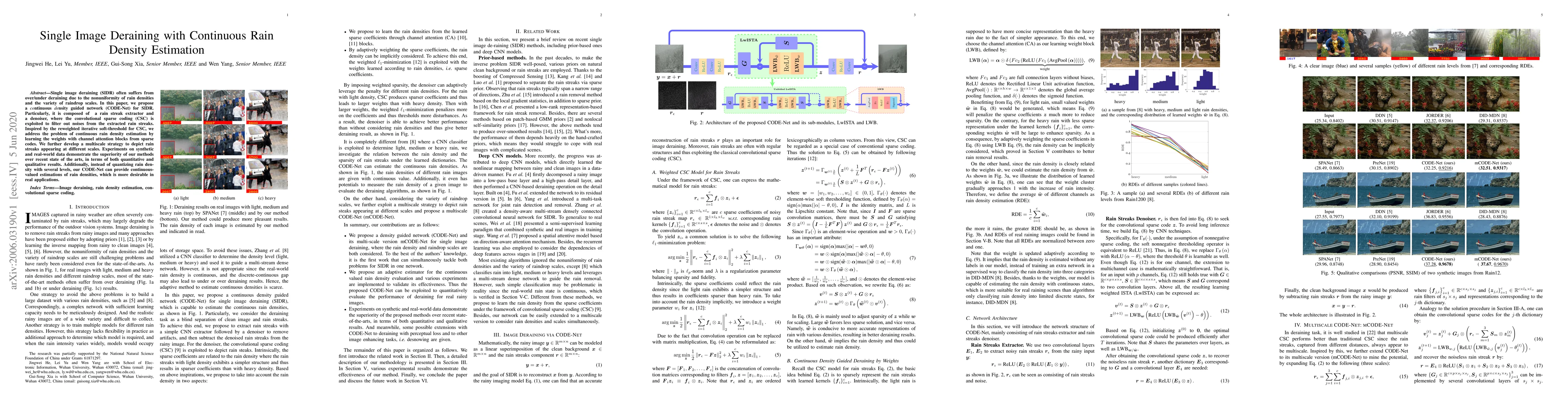This paper proposes CODE-Net, a continuous density guided network for single image deraining, which uses a rain streak extractor and a denoiser with convolutional sparse coding to filter out noise. The method estimates continuous rain densities using channel attention blocks and a multiscale strategy, outperforming recent state-of-the-art methods in both quantitative and qualitative assessments.