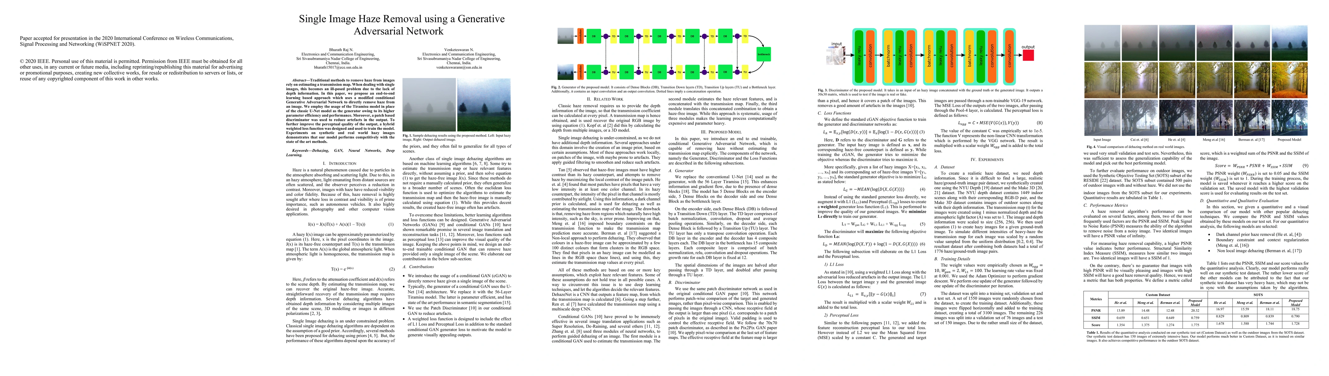 This paper proposes an end-to-end learning method using a modified conditional Generative Adversarial Network for single image haze removal, employing the Tiramisu model for higher efficiency and performance. The approach uses a hybrid weighted loss function and a patch-based discriminator to achieve competitive results against state-of-the-art methods.