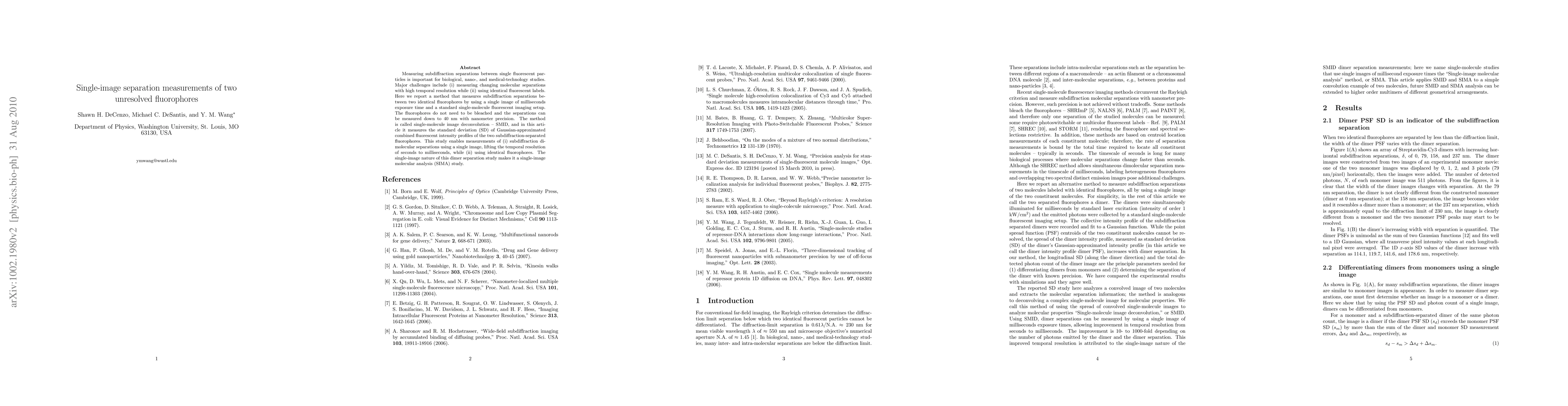 This paper introduces SMID, a method for measuring subdiffraction separations between identical fluorescent particles using a single-image approach, achieving 40 nm precision and millisecond temporal resolution. This single-image molecular analysis (SIMA) technique enhances the study of biological and nano-technology applications.