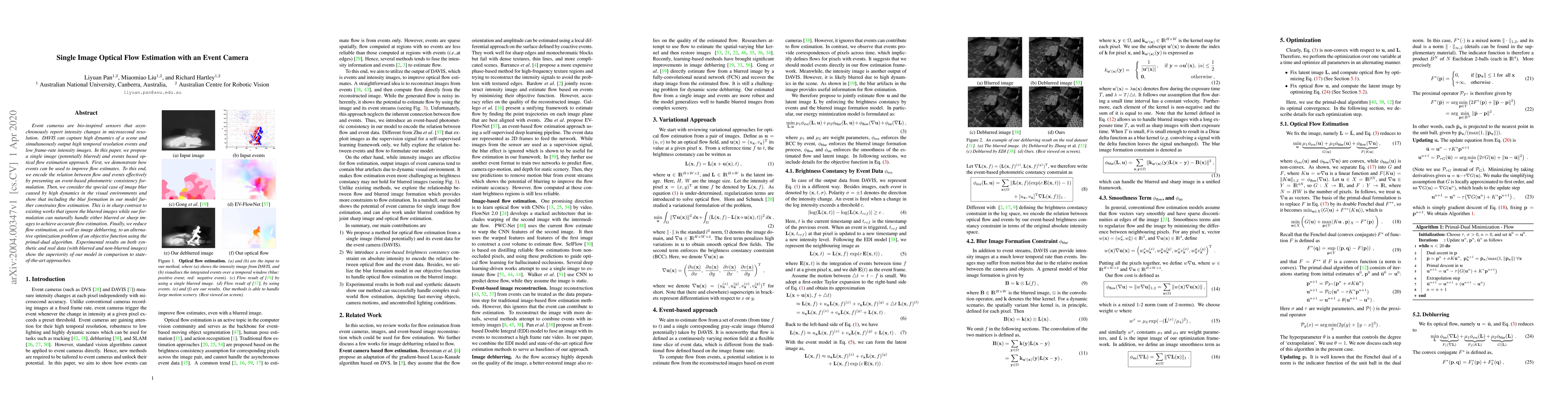 This paper proposes a novel method for optical flow estimation using single images and asynchronous events from an event camera. It introduces an event-based photometric consistency formulation and addresses the challenge of image blur due to high dynamics, achieving superior accuracy compared to existing methods.