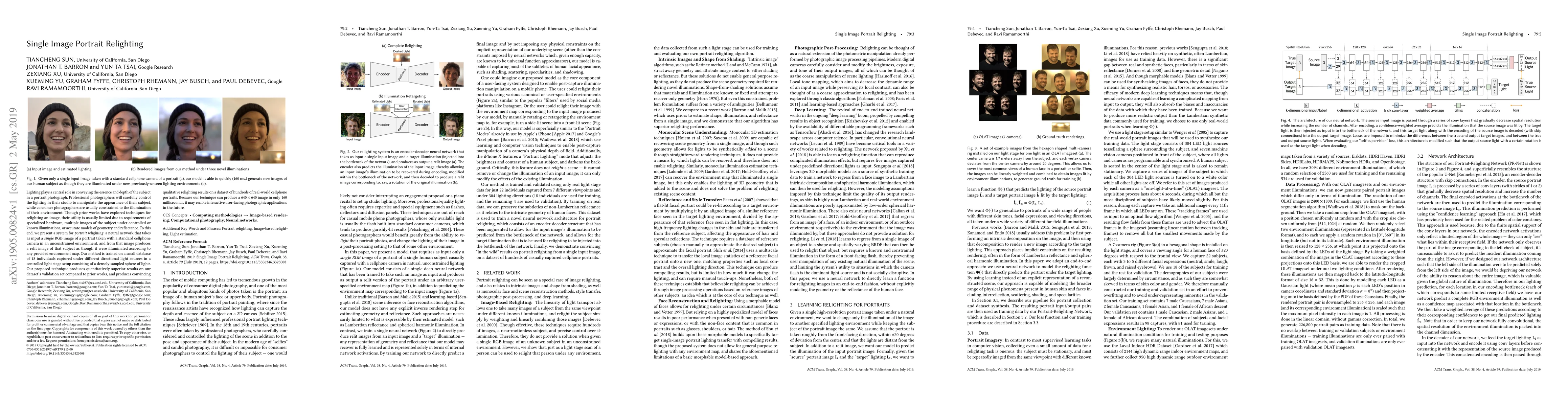 This paper presents a neural network system for relighting portraits from a single RGB image, enabling realistic lighting changes without requiring specialized hardware or multiple images. The method achieves superior results compared to prior works and can generate relit images in 160 milliseconds, potentially enabling interactive photographic applications.