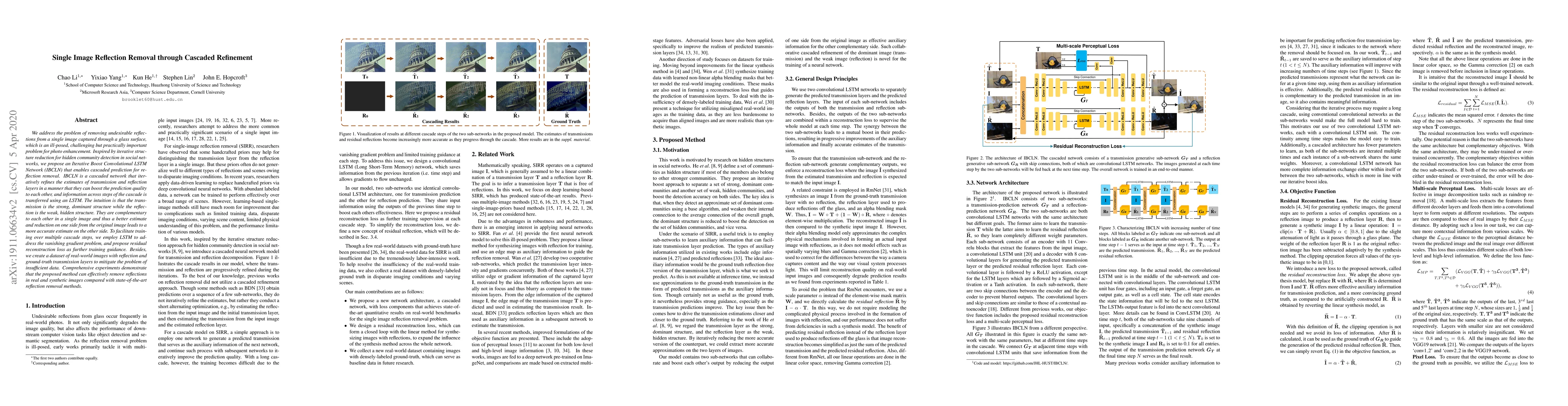 This paper proposes an Iterative Boost Convolutional LSTM Network (IBCLN) for removing reflections from single images captured through glass surfaces. The IBCLN iteratively refines estimates of transmission and reflection layers, leveraging LSTM to address vanishing gradients and residual reconstruction loss for improved accuracy.