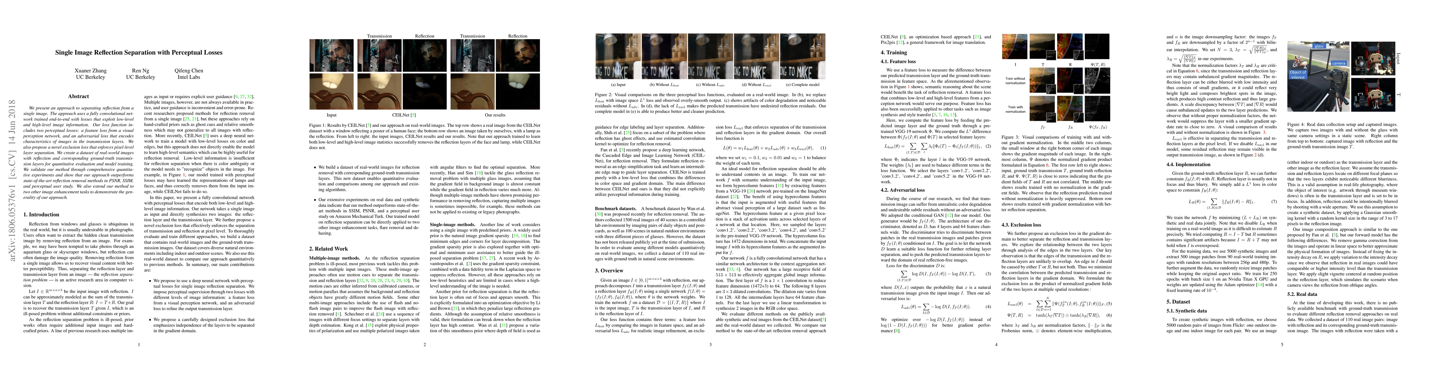 This paper introduces a fully convolutional network for separating reflections from single images using perceptual and adversarial losses, along with a novel exclusion loss. The method is validated against a new dataset and outperforms existing techniques in quantitative metrics and user studies.