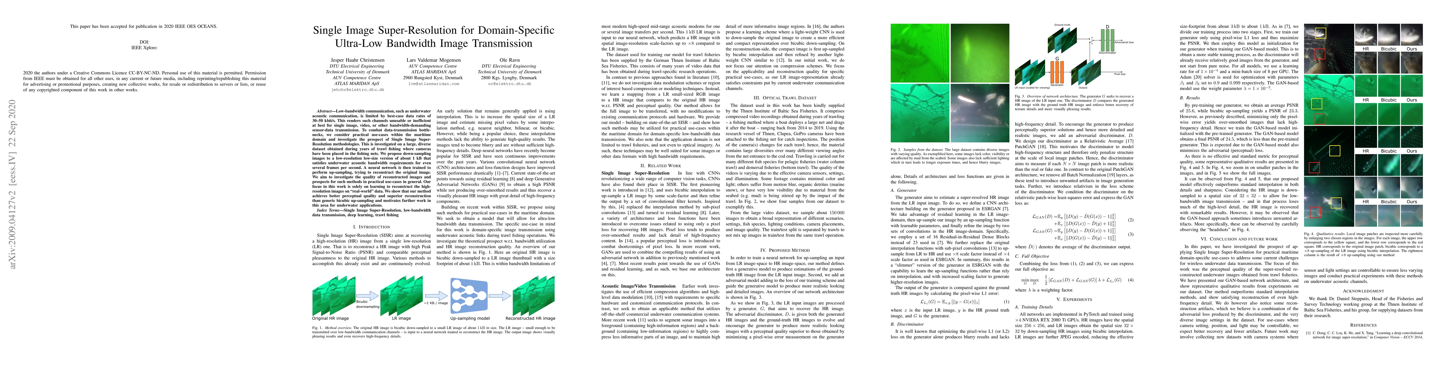 Low-bandwidth communication, such as underwater acoustic communication, is limited by best-case data rates of 30--50 kbit/s. This renders such channels unusable or inefficient at best for single image, video, or other bandwidth-demanding sensor-data transmission. To combat data-transmission bottlenecks, we consider practical use-cases within the maritime domain and investigate the prospect of Single Image Super-Resolution methodologies. This is investigated on a large, diverse dataset obtained during years of trawl fishing where cameras have been placed in the fishing nets. We propose down-sampling images to a low-resolution low-size version of about 1 kB that satisfies underwater acoustic bandwidth requirements for even several frames per second. A neural network is then trained to perform up-sampling, trying to reconstruct the original image. We aim to investigate the quality of reconstructed images and prospects for such methods in practical use-cases in general. Our focus in this work is solely on learning to reconstruct the high-resolution images on "real-world" data. We show that our method achieves better perceptual quality and superior reconstruction than generic bicubic up-sampling and motivates further work in this area for underwater applications.