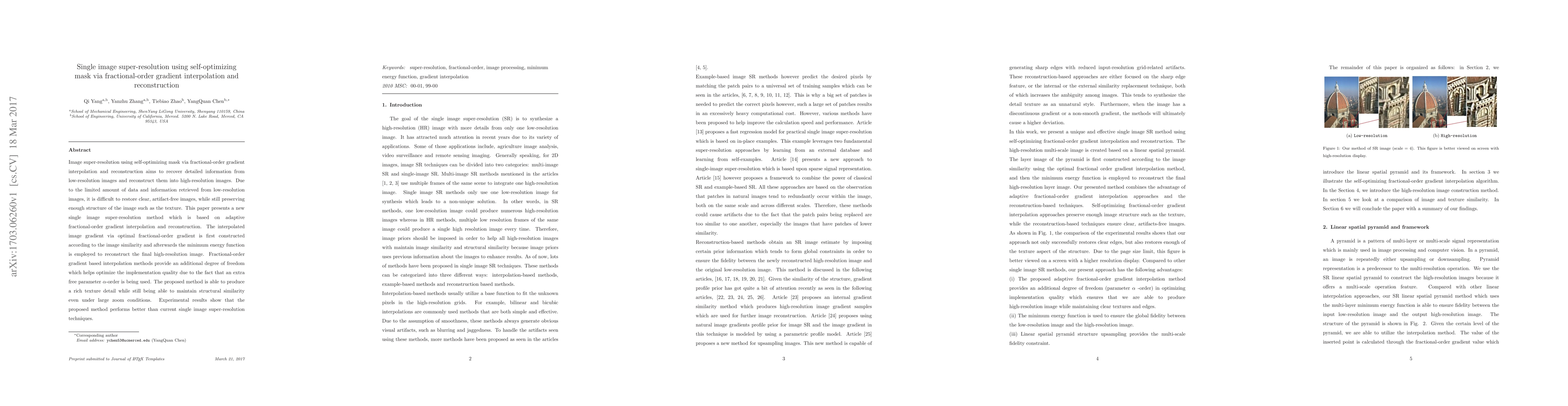 Image super-resolution using self-optimizing mask via fractional-order gradient interpolation and reconstruction aims to recover detailed information from low-resolution images and reconstruct them into high-resolution images. Due to the limited amount of data and information retrieved from low-resolution images, it is difficult to restore clear, artifact-free images, while still preserving enough structure of the image such as the texture. This paper presents a new single image super-resolution method which is based on adaptive fractional-order gradient interpolation and reconstruction. The interpolated image gradient via optimal fractional-order gradient is first constructed according to the image similarity and afterwards the minimum energy function is employed to reconstruct the final high-resolution image. Fractional-order gradient based interpolation methods provide an additional degree of freedom which helps optimize the implementation quality due to the fact that an extra free parameter $\alpha$-order is being used. The proposed method is able to produce a rich texture detail while still being able to maintain structural similarity even under large zoom conditions. Experimental results show that the proposed method performs better than current single image super-resolution techniques.