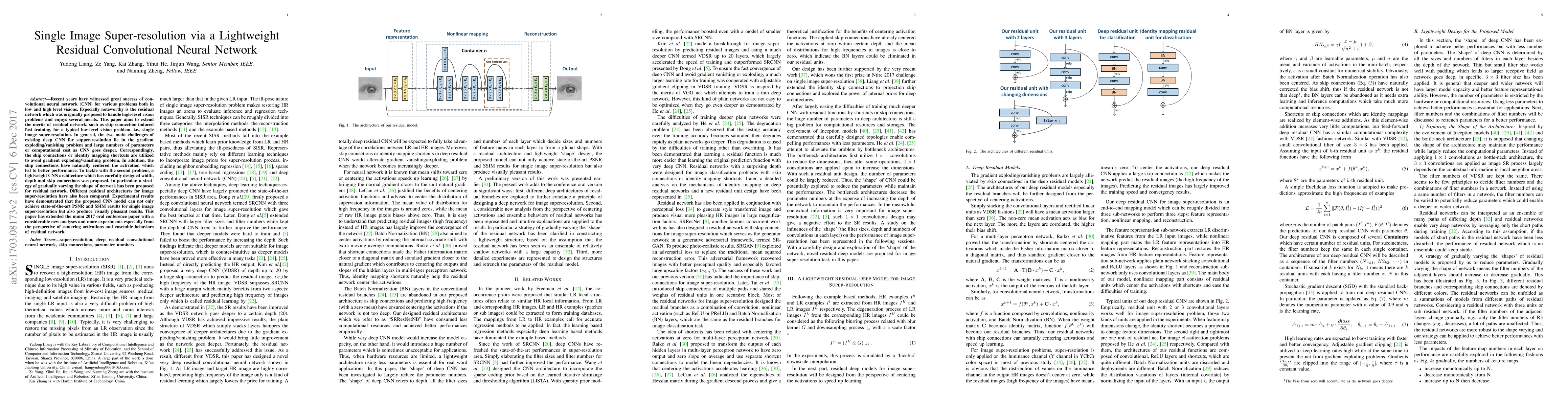 This paper proposes a lightweight residual convolutional neural network for single image super-resolution, addressing gradient issues and computational costs through skip connections and a carefully designed network architecture. Experimental results show state-of-the-art performance and visually pleasing results.