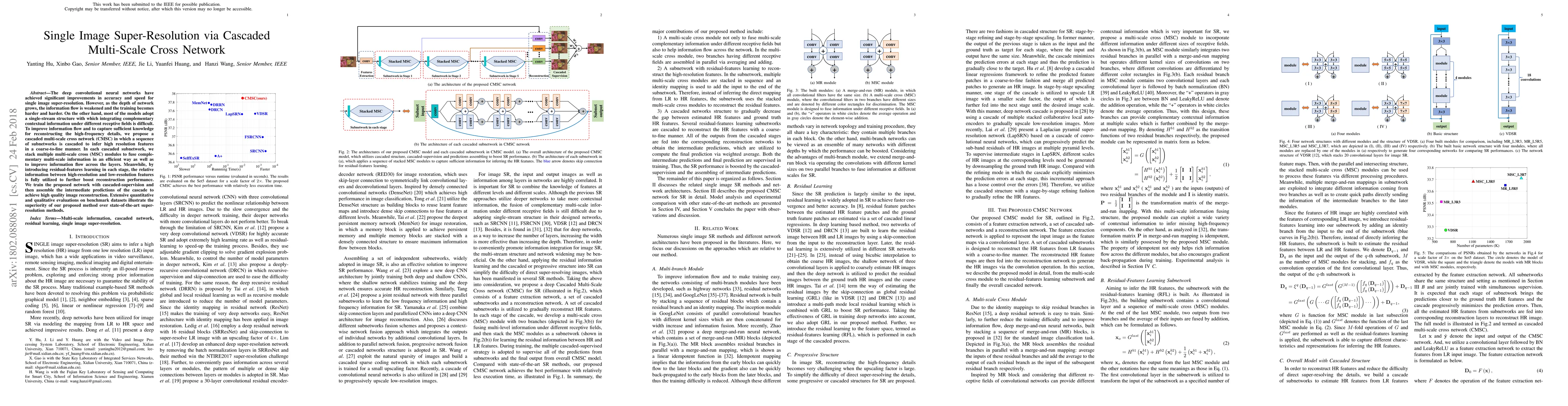 The paper proposes a cascaded multi-scale cross network (CMSC) for single image super-resolution, utilizing a sequence of subnetworks to infer high-resolution features in a coarse-to-fine manner, and stacking multi-scale cross modules to enhance information flow and capture high-frequency details. The method achieves superior performance over state-of-the-art techniques through efficient multi-scale information fusion and residual-features learning.