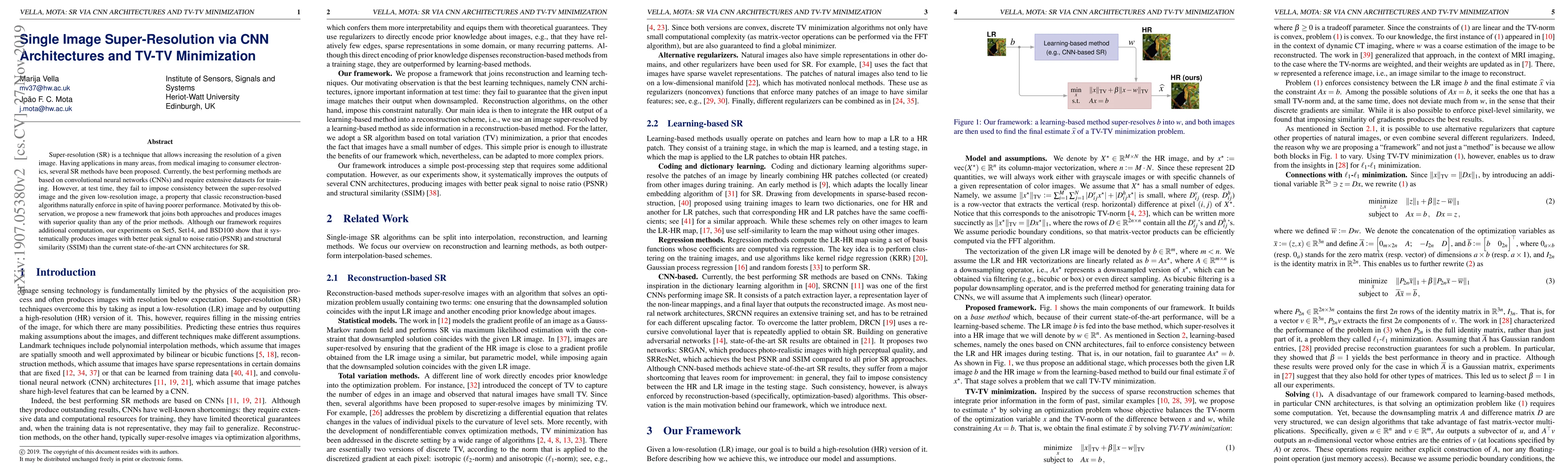 This research paper proposes a novel framework for single image super-resolution that combines convolutional neural networks (CNNs) with TV-TV minimization to achieve higher resolution images while maintaining consistency with the original low-resolution image. The proposed method outperforms existing state-of-the-art CNN-based approaches in terms of peak signal to noise ratio (PSNR) and structural similarity (SSIM), as demonstrated through experiments on benchmark datasets.