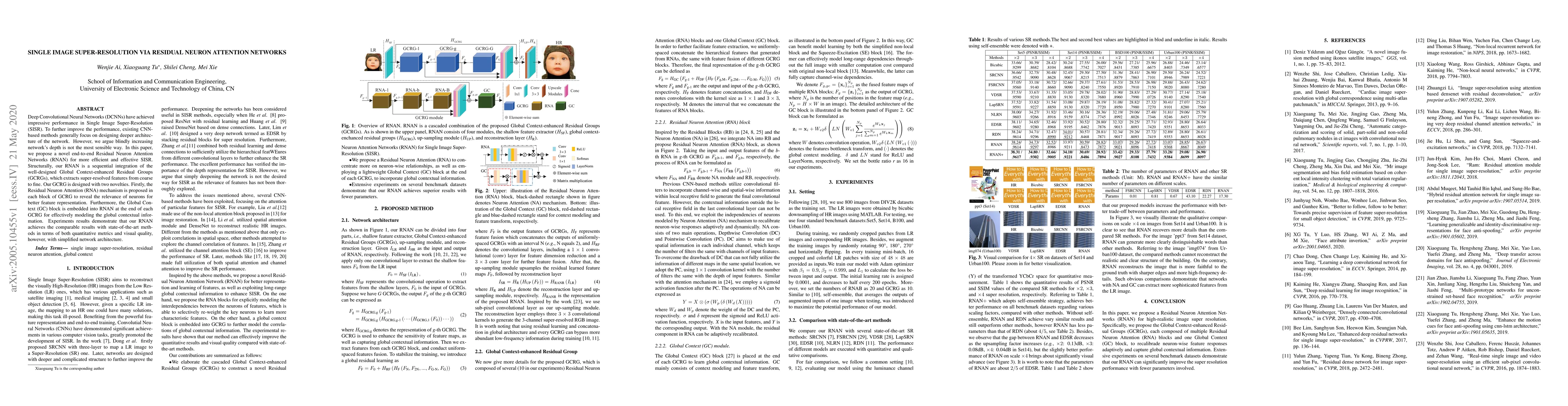 This paper proposes a novel Residual Neuron Attention Networks (RNAN) for Single Image Super-Resolution (SISR), emphasizing efficient feature extraction through Global Context-enhanced Residual Groups (GCRGs) and a Residual Neuron Attention mechanism. The RNAN achieves competitive results with simpler architecture compared to state-of-the-art methods.