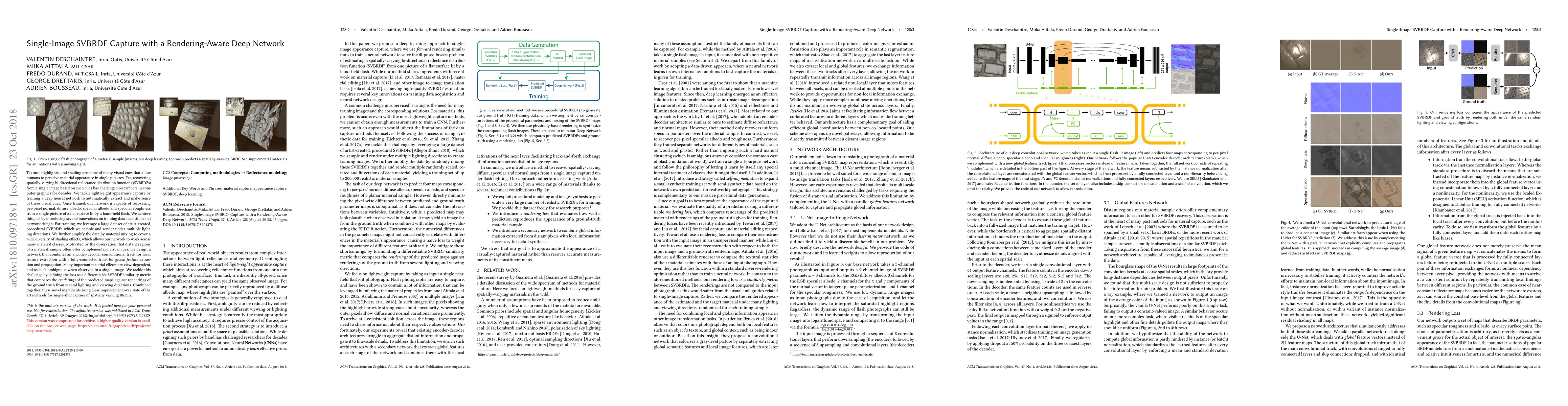 This research introduces a deep neural network that extracts and interprets visual cues from single images to recover spatially-varying material appearance, represented as SVBRDFs. The network combines local and global feature extraction, trained on a dataset of procedural SVBRDFs rendered under various lighting directions and amplified via material mixing. The loss function is a differentiable SVBRDF similarity metric comparing predicted and ground truth renderings from multiple lighting and viewing directions, surpassing existing single-image SVBRDF capture methods.