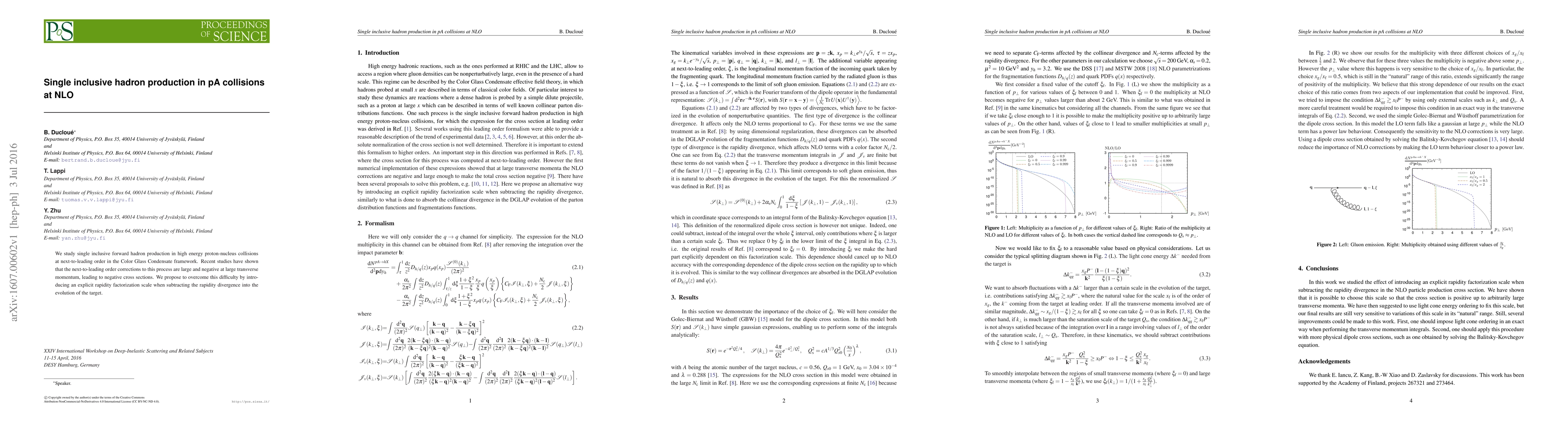 This paper investigates single inclusive forward hadron production in high-energy proton-nucleus collisions at next-to-leading order within the Color Glass Condensate framework, addressing large negative corrections and potential negative cross sections by introducing a rapidity factorization scale.