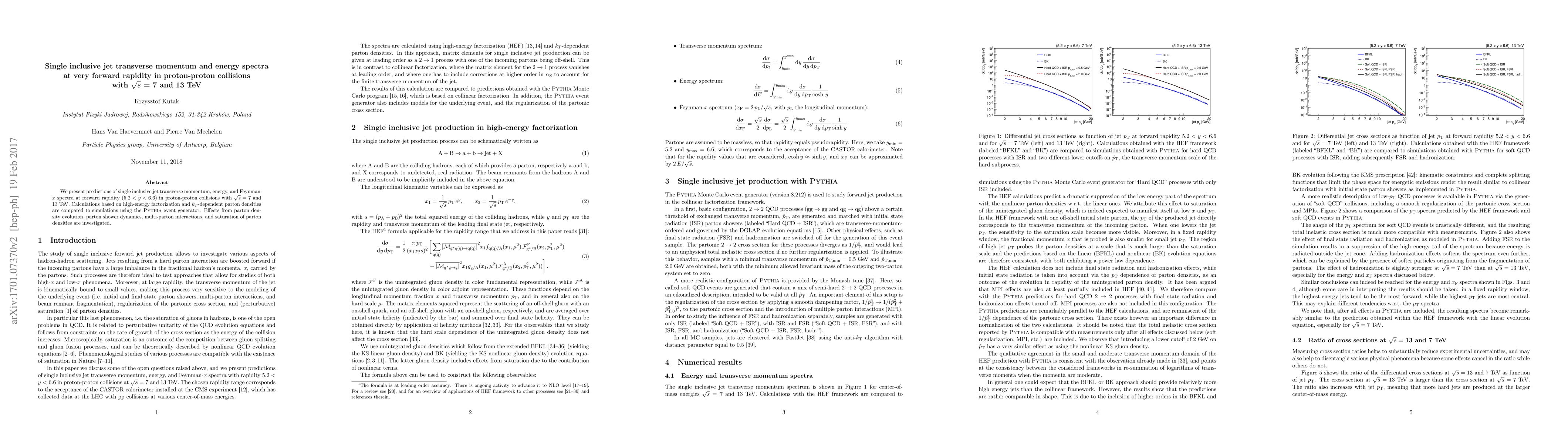We present predictions of single inclusive jet transverse momentum, energy, and Feynman-$x$ spectra at forward rapidity ($5.2 < y < 6.6$) in proton-proton collisions with $\sqrt{s} = 7$ and 13 TeV. Calculations based on high-energy factorization and $k_T$-dependent parton densities are compared to simulations using the \pythia\ event generator. Effects from parton density evolution, parton shower dynamics, multi-parton interactions, and saturation of parton densities are investigated.