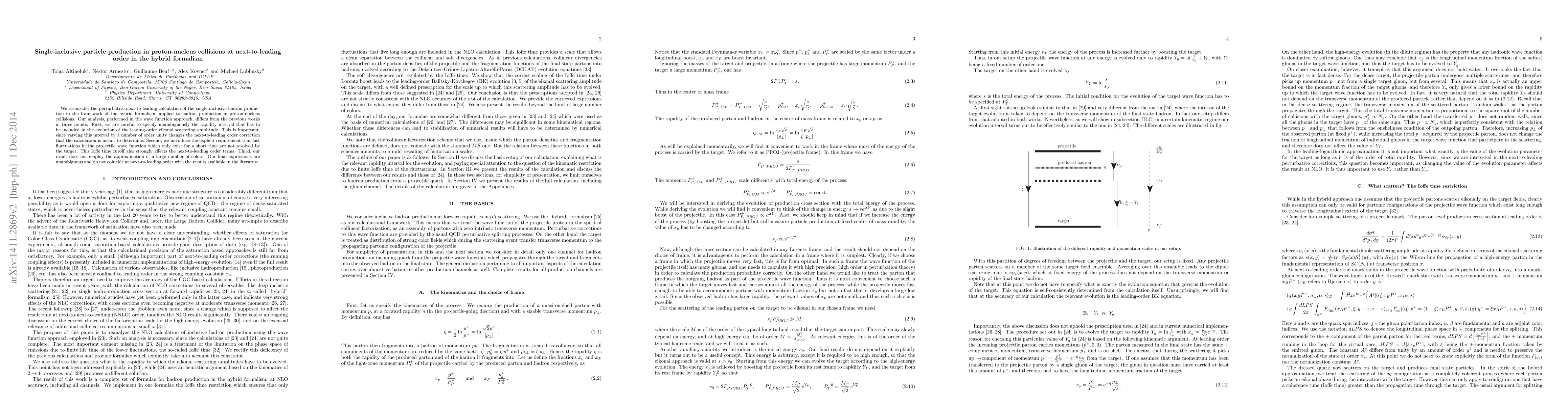 We reconsider the perturbative next-to-leading calculation of the single inclusive hadron production in the framework of the hybrid formalism, applied to hadron production in proton-nucleus collisions. Our analysis, performed in the wave function approach, differs from the previous works in three points. First, we are careful to specify unambiguously the rapidity interval that has to be included in the evolution of the leading-order eikonal scattering amplitude. This is important, since varying this interval by a number of order unity changes the next-to-leading order correction that the calculation is meant to determine. Second, we introduce the explicit requirement that fast fluctuations in the projectile wave function which only exist for a short time are not resolved by the target. This Ioffe time cutoff also strongly affects the next-to-leading order terms. Third, our result does not employ the approximation of a large number of colors. Our final expressions are unambiguous and do not coincide at next-to-leading order with the results available in the literature.
