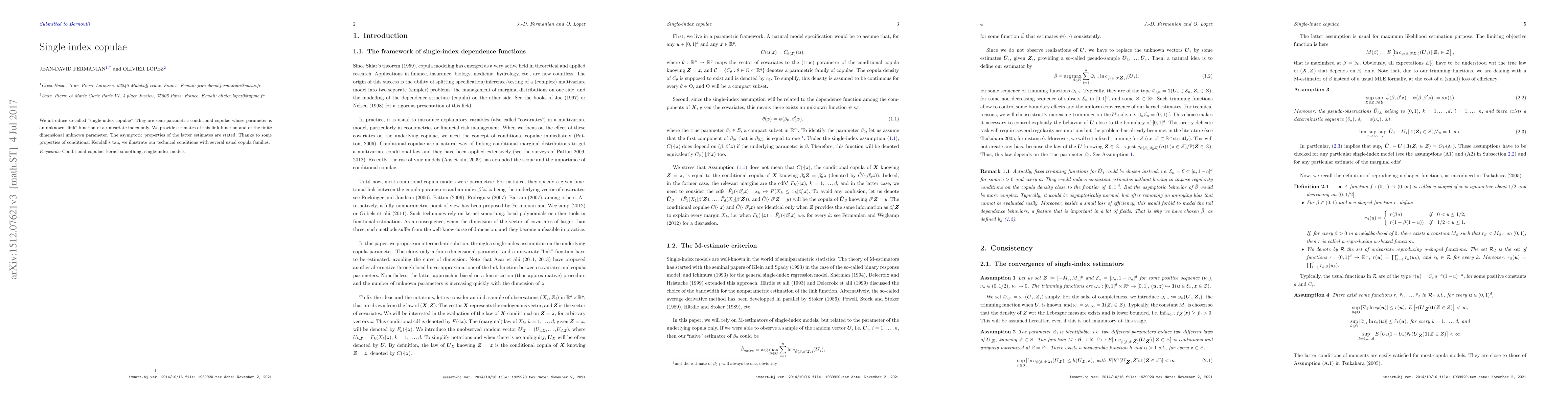Researchers introduce single-index copulae, a semi-parametric method for modeling correlations between variables with an unknown link function that depends on only one index variable.