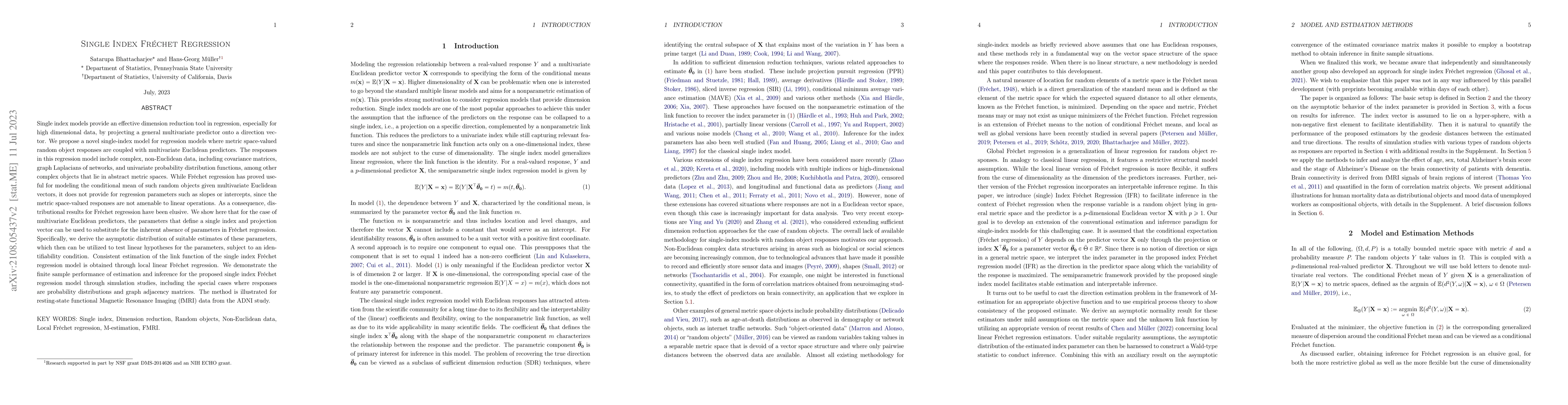 The paper proposes a novel single-index model for Fr\'echet regression that accommodates metric space-valued responses, such as covariance matrices, alongside multivariate Euclidean predictors. It derives the asymptotic distribution for parameter estimates, enabling linear hypothesis testing, and demonstrates the method's performance through simulations and an application to fMRI data from the ADNI study.