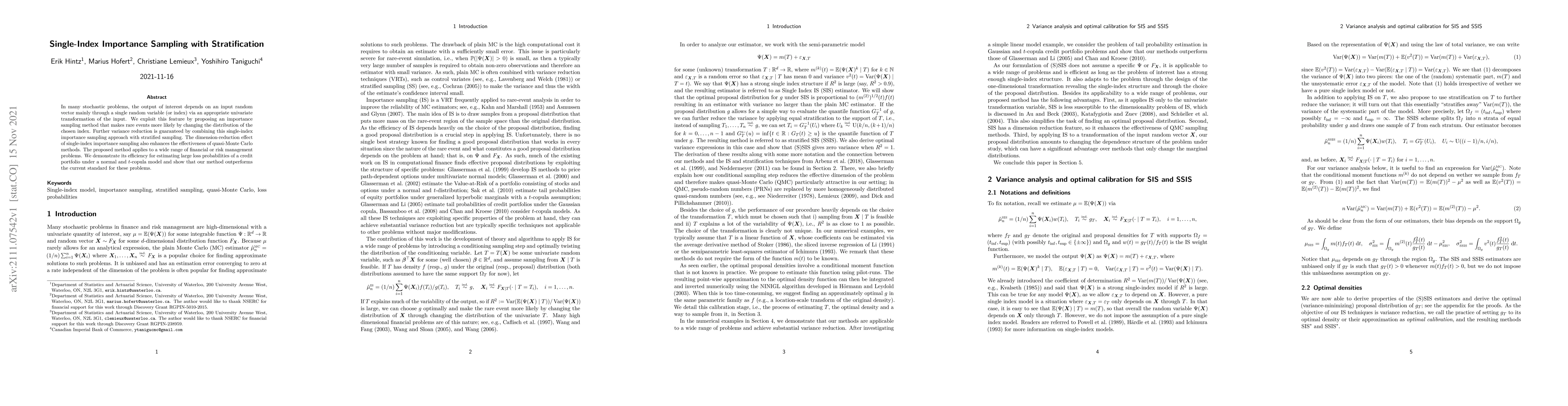In many stochastic problems, the output of interest depends on an input random vector mainly through a single random variable (or index) via an appropriate univariate transformation of the input. We exploit this feature by proposing an importance sampling method that makes rare events more likely by changing the distribution of the chosen index. Further variance reduction is guaranteed by combining this single-index importance sampling approach with stratified sampling. The dimension-reduction effect of single-index importance sampling also enhances the effectiveness of quasi-Monte Carlo methods. The proposed method applies to a wide range of financial or risk management problems. We demonstrate its efficiency for estimating large loss probabilities of a credit portfolio under a normal and t-copula model and show that our method outperforms the current standard for these problems.