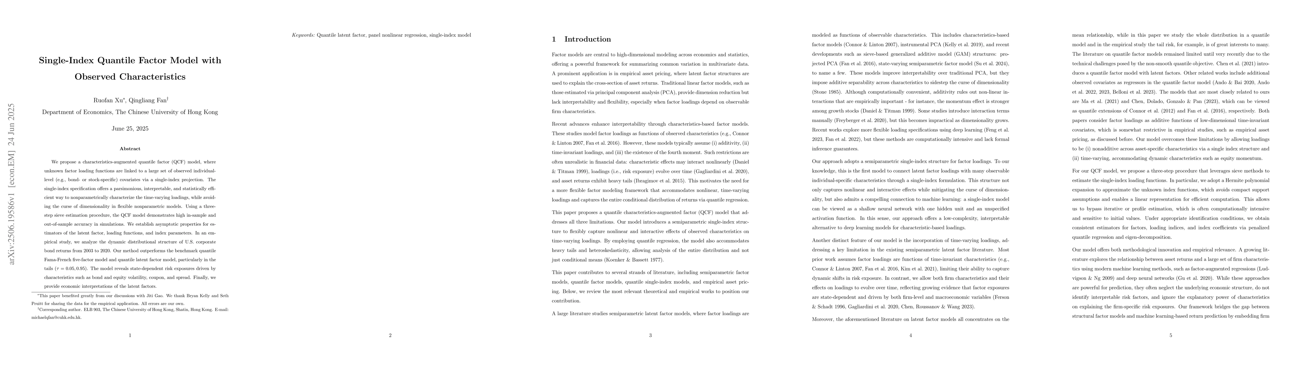 We propose a characteristics-augmented quantile factor (QCF) model, where unknown factor loading functions are linked to a large set of observed individual-level (e.g., bond- or stock-specific) covariates via a single-index projection. The single-index specification offers a parsimonious, interpretable, and statistically efficient way to nonparametrically characterize the time-varying loadings, while avoiding the curse of dimensionality in flexible nonparametric models. Using a three-step sieve estimation procedure, the QCF model demonstrates high in-sample and out-of-sample accuracy in simulations. We establish asymptotic properties for estimators of the latent factor, loading functions, and index parameters. In an empirical study, we analyze the dynamic distributional structure of U.S. corporate bond returns from 2003 to 2020. Our method outperforms the benchmark quantile Fama-French five-factor model and quantile latent factor model, particularly in the tails ($\tau=0.05, 0.95$). The model reveals state-dependent risk exposures driven by characteristics such as bond and equity volatility, coupon, and spread. Finally, we provide economic interpretations of the latent factors.