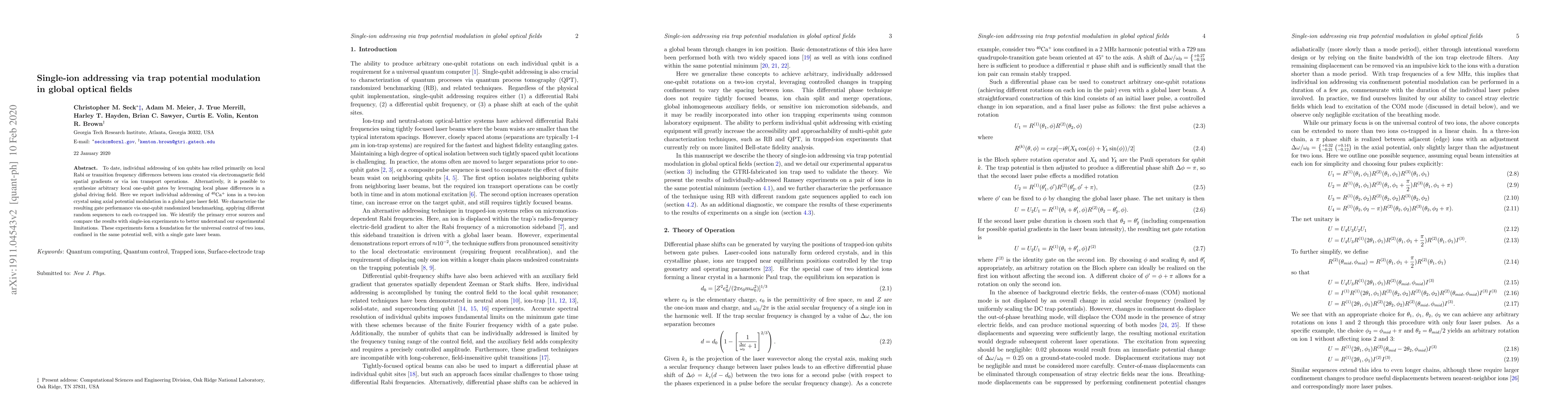 To date, individual addressing of ion qubits has relied primarily on local Rabi or transition frequency differences between ions created via electromagnetic field spatial gradients or via ion transport operations. Alternatively, it is possible to synthesize arbitrary local one-qubit gates by leveraging local phase differences in a global driving field. Here we report individual addressing of $^{40}$Ca$^+$ ions in a two-ion crystal using axial potential modulation in a global gate laser field. We characterize the resulting gate performance via one-qubit randomized benchmarking, applying different random sequences to each co-trapped ion. We identify the primary error sources and compare the results with single-ion experiments to better understand our experimental limitations. These experiments form a foundation for the universal control of two ions, confined in the same potential well, with a single gate laser beam.