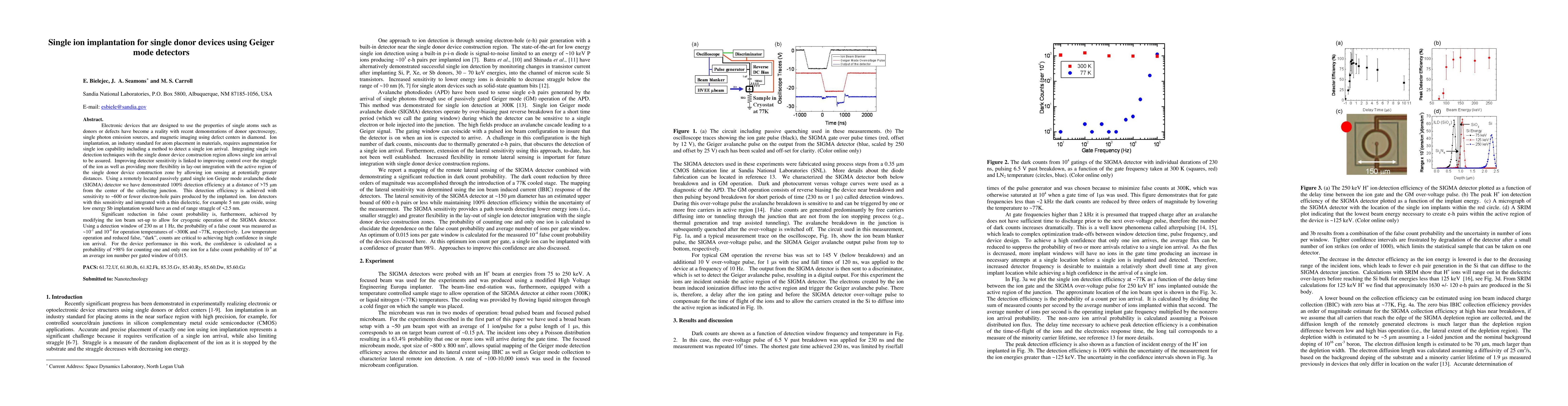 This paper demonstrates the use of single ion Geiger mode avalanche diode (SIGMA) detectors for single donor devices, achieving 100% detection efficiency at distances over 75 um. The study highlights the importance of low-energy ion implantation and cryogenic operation to reduce false counts and improve device confidence, achieving a >98% probability of detecting a single ion.