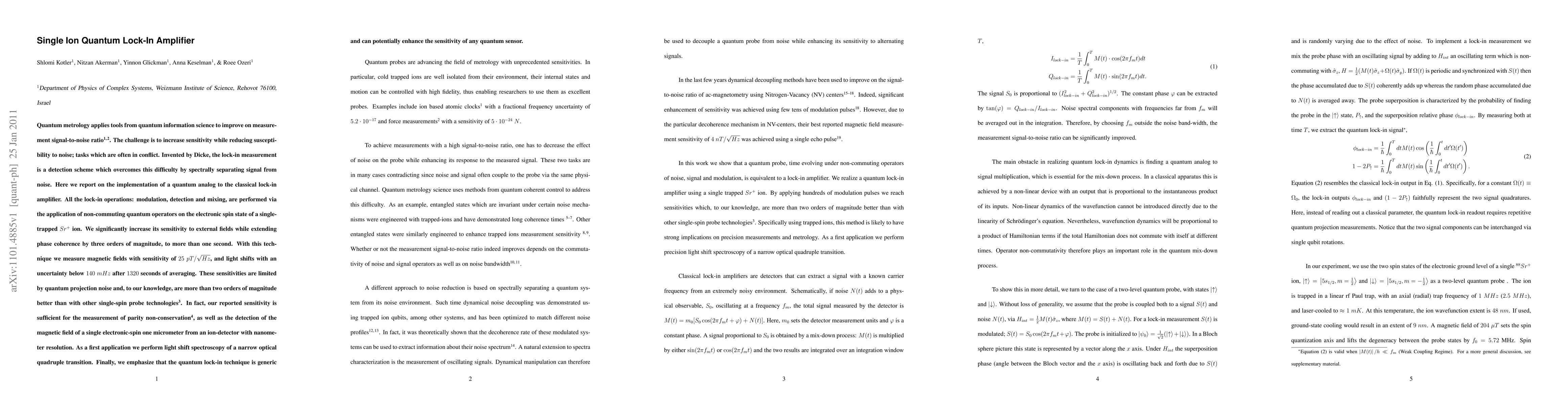 This paper introduces a quantum analog of a classical lock-in amplifier using a single trapped Sr+ ion, achieving unprecedented sensitivity and phase coherence. The technique measures magnetic fields at 25 pT/sqrt(Hz) and light shifts, demonstrating potential for applications like parity non-conservation detection.