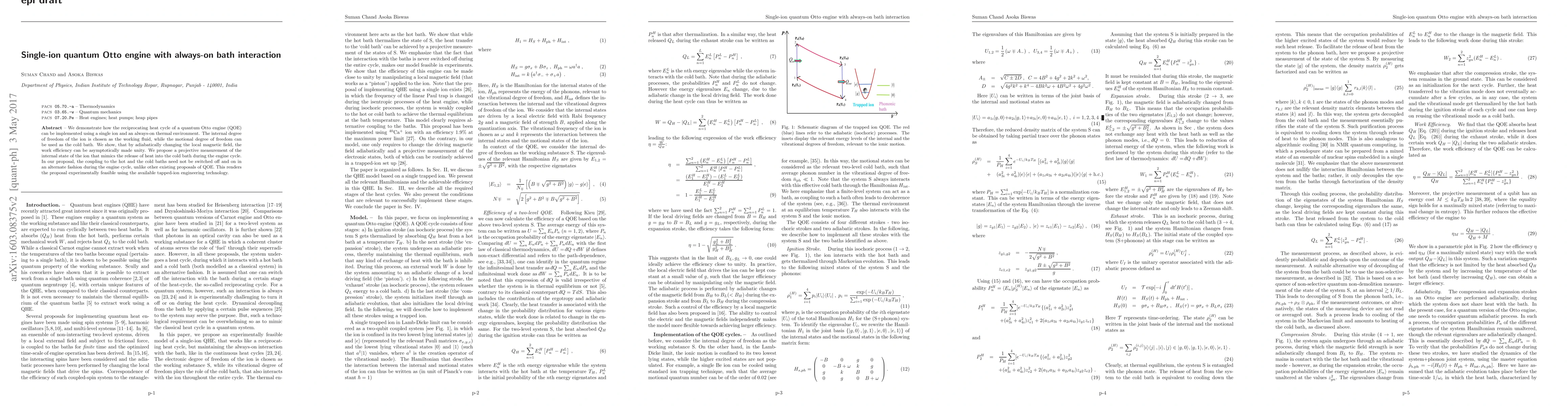 This paper proposes a single-ion quantum Otto engine where the ion operates with an always-on thermal environment, achieving near-unity work efficiency through adiabatic magnetic field changes. Unlike previous designs, the coupling to hot and cold baths remains constant, enhancing experimental feasibility.