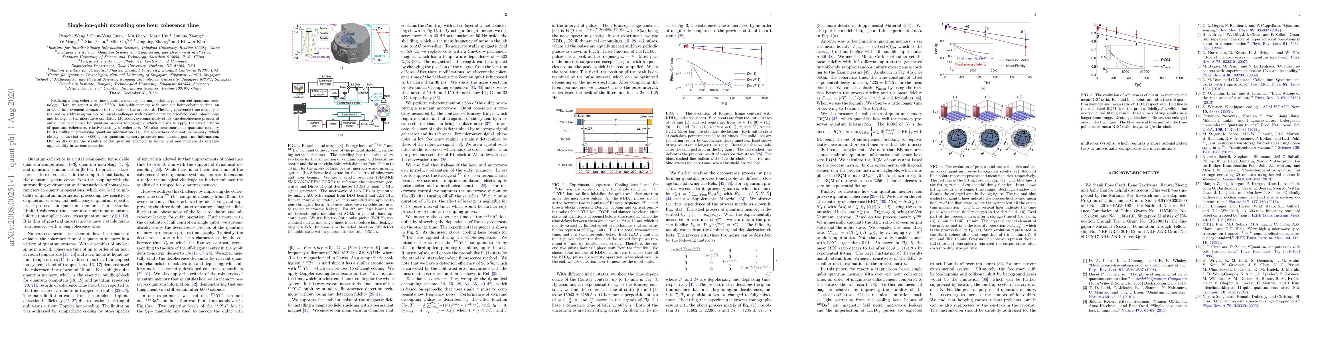 This paper reports a significant advancement in quantum memory with a single \Yb ion-qubit achieving over one hour coherence time, addressing technical challenges like magnetic-field noise and phase noise. The study benchmarks the quantum memory's robustness in preserving quantum information for extended periods, demonstrating its potential for diverse applications.