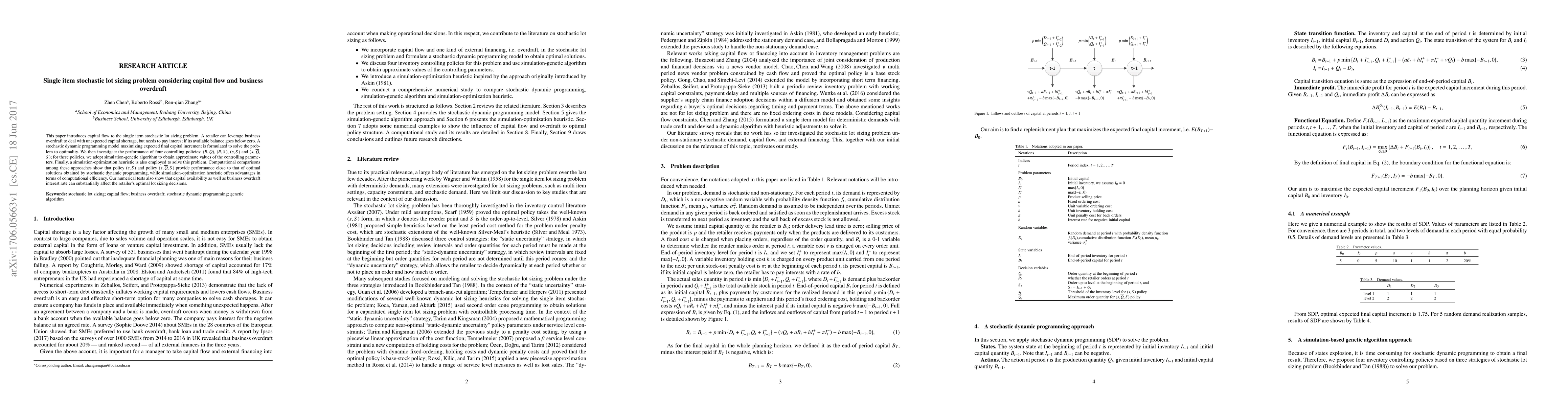 This paper develops a stochastic dynamic programming model for a single item lot sizing problem considering capital flow and business overdraft, and evaluates four controlling policies. Simulation-genetic algorithm and heuristic methods are used to find optimal parameters and solutions, showing that policies ($s, S$) and ($s, \overline{Q}, S$) are near-optimal, while the heuristic method offers better computational efficiency.