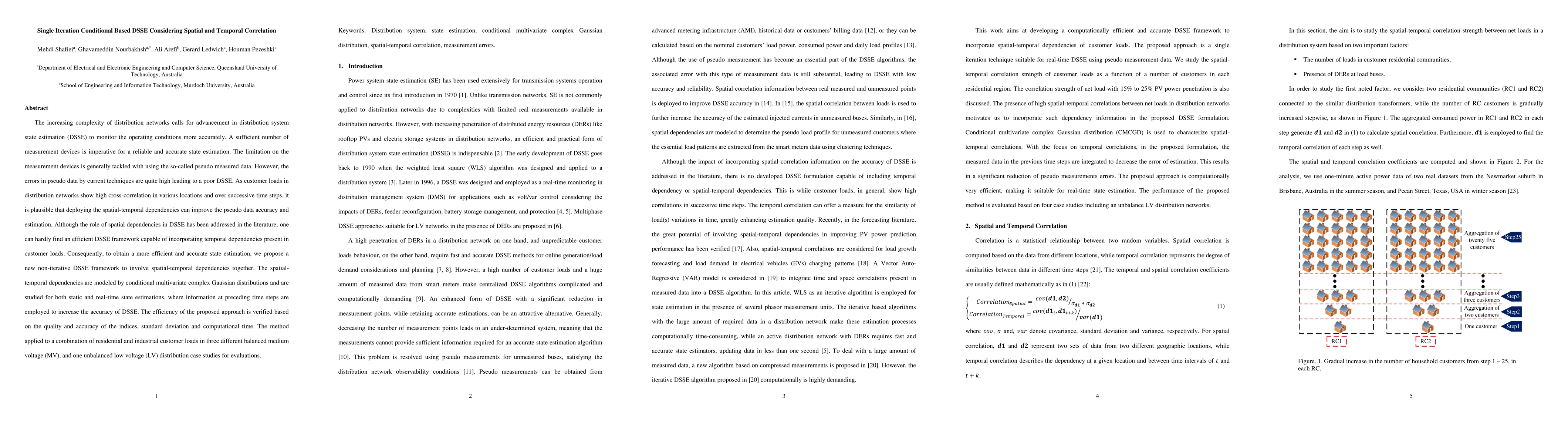 The increasing complexity of distribution network calls for advancement in distribution system state estimation (DSSE) to monitor the operating conditions more accurately. Sufficient number of measurements is imperative for a reliable and accurate state estimation. The limitation on the measurement devices is generally tackled with using the so-called pseudo measured data. However, the errors in pseudo data by cur-rent techniques are quite high leading to a poor DSSE. As customer loads in distribution networks show high cross-correlation in various locations and over successive time steps, it is plausible that deploying the spatial-temporal dependencies can improve the pseudo data accuracy and estimation. Although, the role of spatial dependency in DSSE has been addressed in the literature, one can hardly find an efficient DSSE framework capable of incorporating temporal dependencies present in customer loads. Consequently, to obtain a more efficient and accurate state estimation, we propose a new non-iterative DSSE framework to involve spatial-temporal dependencies together. The spatial-temporal dependencies are modeled by conditional multivariate complex Gaussian distributions and are studied for both static and real-time state estimations, where information at preceding time steps are employed to increase the accuracy of DSSE. The efficiency of the proposed approach is verified based on quality and accuracy indices, standard deviation and computational time. Two balanced medium voltage (MV) and one unbalanced low voltage (LV) distribution case studies are used for evaluations.