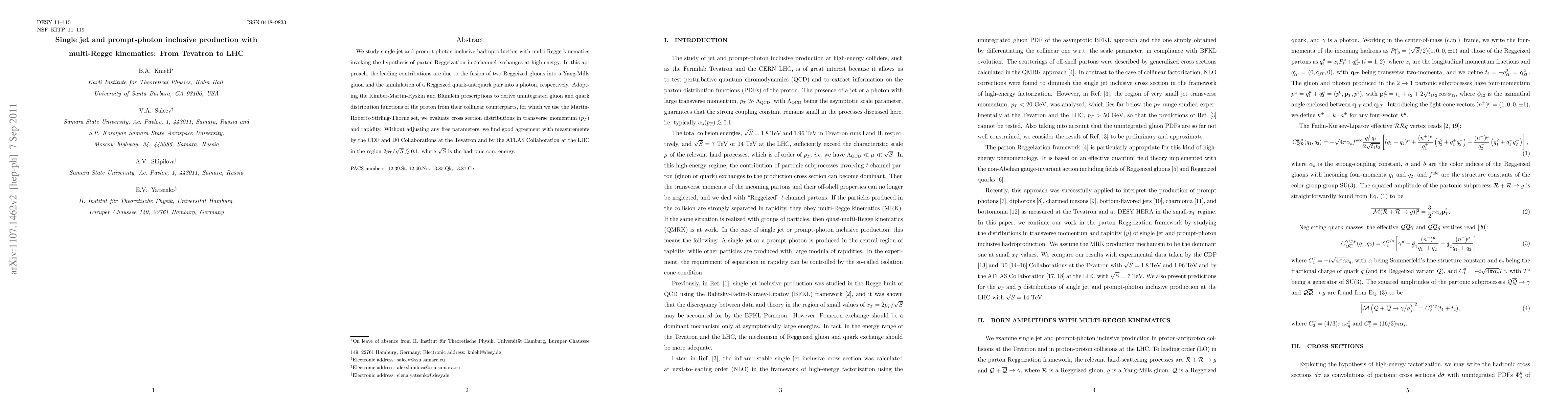 We study single jet and prompt-photon inclusive hadroproduction with multi-Regge kinematics invoking the hypothesis of parton Reggeization in t-channel exchanges at high energy. In this approach, the leading contributions are due to the fusion of two Reggeized gluons into a Yang-Mills gluon and the annihilation of a Reggeized quark-antiquark pair into a photon, respectively. Adopting the Kimber-Martin-Ryskin and Bluemlein prescription to derive unintegrated gluon and quark distribution functions of the proton from their collinear counterparts, for which we use the Martin-Roberts-Stirling-Thorne set, we evaluate cross section distributions in transverse momentum (p_T) and rapidity. Without adjusting any free parameters, we find good agreement with measurements by the CDF and D0 Collaborations at the Tevatron and by the ATLAS Collaboration at the LHC in the region 2p_T/sqrt{S} < 0.1, where sqrt{S} is the hadronic c.m. energy.