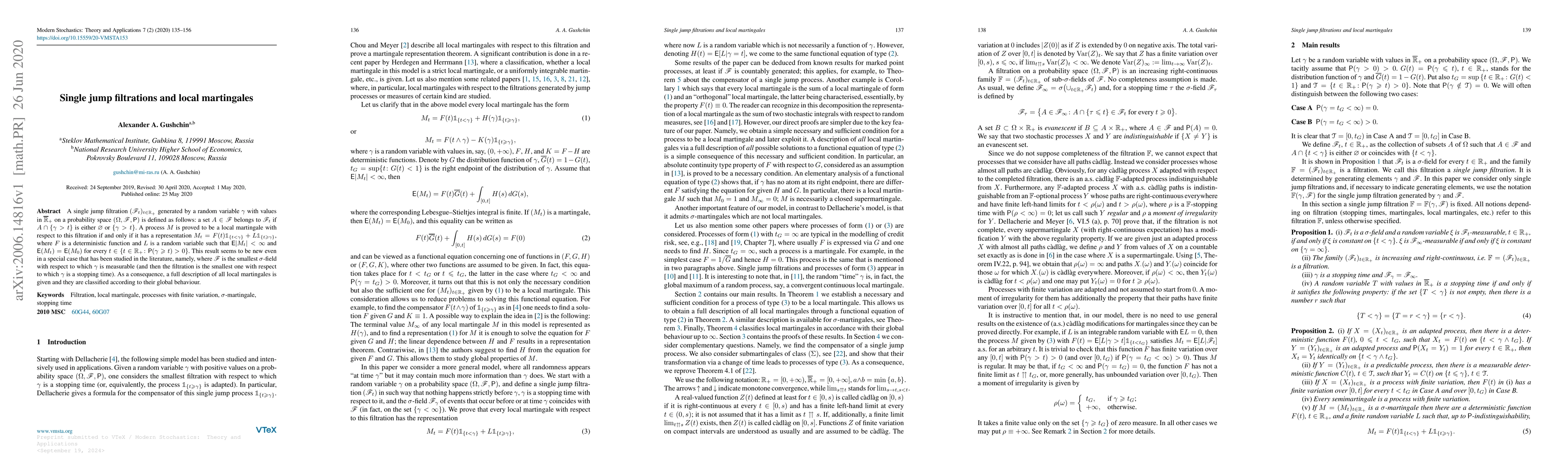 A single jump filtration $({\mathscr{F}}_t)_{t\in \mathbb{R}_+}$ generated by a random variable $\gamma$ with values in $\overline{\mathbb{R}}_+$ on a probability space $(\Omega ,{\mathscr{F}},\mathsf{P})$ is defined as follows: a set $A\in {\mathscr{F}}$ belongs to ${\mathscr{F}}_t$ if $A\cap \{\gamma >t\}$ is either $\varnothing$ or $\{\gamma >t\}$. A process $M$ is proved to be a local martingale with respect to this filtration if and only if it has a representation $M_t=F(t){\mathbb{1}}_{\{t<\gamma \}}+L{\mathbb{1}}_{\{t\geqslant \gamma \}}$, where $F$ is a deterministic function and $L$ is a random variable such that $\mathsf{E}|M_t|<\infty$ and $\mathsf{E}(M_t)=\mathsf{E}(M_0)$ for every $t\in \{t\in \mathbb{R}_+:{\mathsf{P}}(\gamma \geqslant t)>0\}$. This result seems to be new even in a special case that has been studied in the literature, namely, where ${\mathscr{F}}$ is the smallest $\sigma$-field with respect to which $\gamma$ is measurable (and then the filtration is the smallest one with respect to which $\gamma$ is a stopping time). As a consequence, a full description of all local martingales is given and they are classified according to their global behaviour.