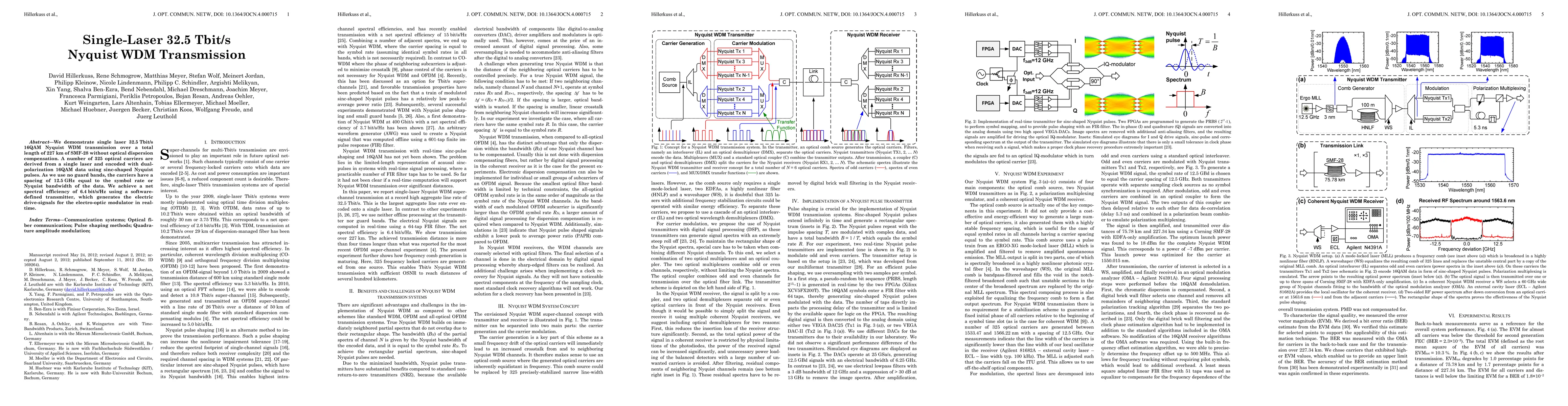 This paper demonstrates a record-breaking 32.5 Tbit/s Nyquist WDM transmission over 227 km of SMF-28 using 325 optical carriers from a single laser, achieving a spectral efficiency of 6.4 bit/s/Hz without optical dispersion compensation. The system employs 16QAM and sinc-shaped Nyquist pulses with no guard bands.