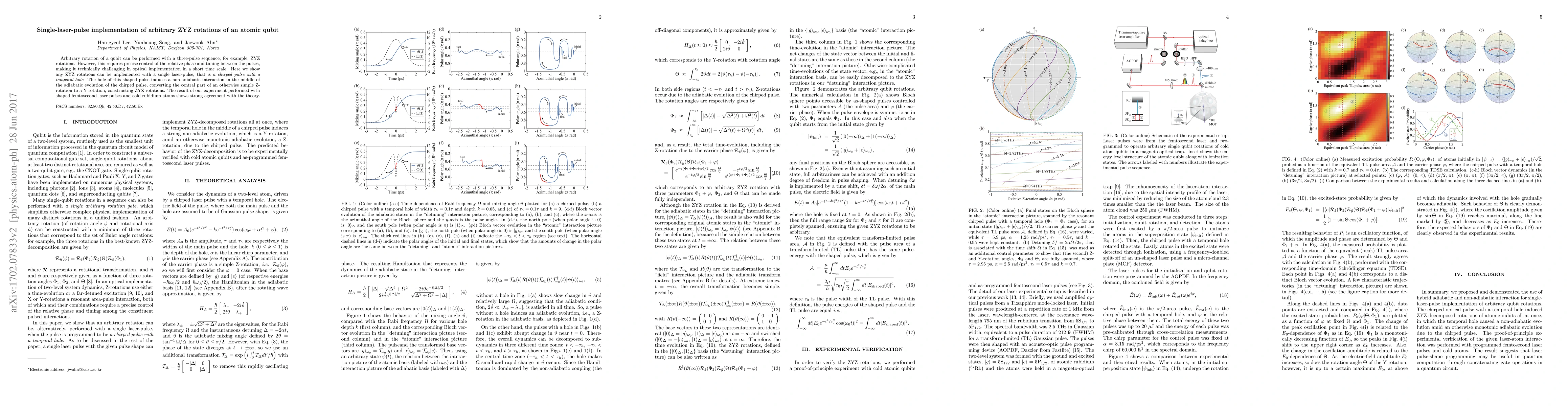 This paper demonstrates a single-laser-pulse method for implementing arbitrary ZYZ rotations of an atomic qubit using a chirped pulse with a temporal hole, simplifying the complex timing and phase control required in traditional multi-pulse sequences. Experimental results with shaped femtosecond laser pulses and cold rubidium atoms align well with theoretical predictions.