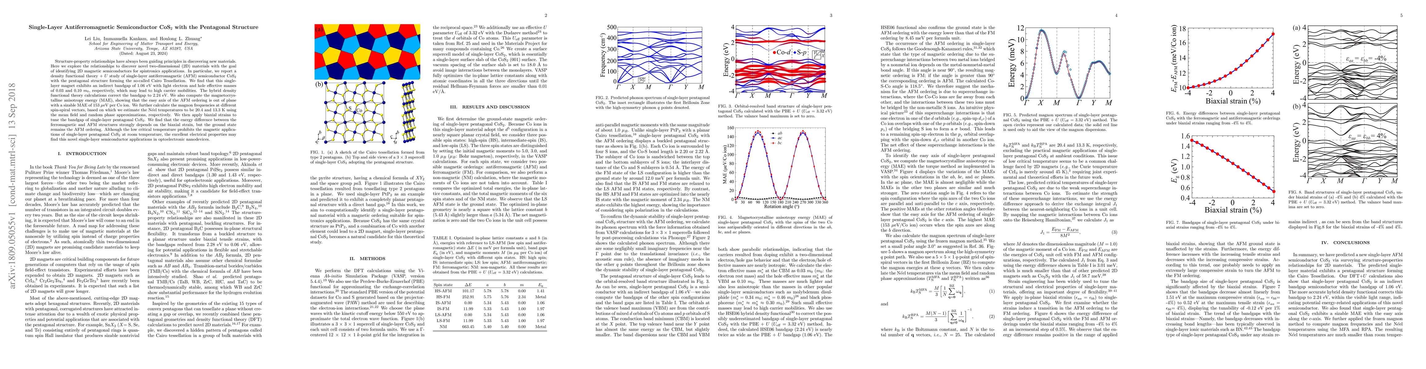 Structure-property relationships have always been guiding principles in discovering new materials. Here we explore the relationships to discover novel two-dimensional (2D) materials with the goal of identifying 2D magnetic semiconductors for spintronics applications. In particular, we report a density functional theory + $U$ study of single-layer antiferromagnetic (AFM) semiconductor CoS$_2$ with the pentagonal structure forming the so-called Cairo Tessellation. We find that this single-layer magnet exhibits an indirect bandgap of 1.06 eV with light electron and hole effective masses of 0.03 and 0.10 $m_0$, respectively, which may lead to high carrier mobilities. The hybrid density functional theory calculations correct the bandgap to 2.24 eV. We also compute the magnetocrystalline anisotropy energy (MAE), showing that the easy axis of the AFM ordering is out of plane with a sizable MAE of 153 $\mu$eV per Co ion. We further calculate the magnon frequencies at different spin-spiral vectors, based on which we estimate the N$\acute{e}$el temperatures to be 20.4 and 13.3 K using the mean field and random phase approximations, respectively. We then apply biaxial strains to tune the bandgap of single-layer pentagonal CoS$_2$. We find that the energy difference between the ferromagnetic and AFM structures strongly depends on the biaxial strain, but the ground state remains the AFM ordering. Although the low critical temperature prohibits the magnetic applications of single-layer pentagonal CoS$_2$ at room temperature, the excellent electrical properties may find this novel single-layer semiconductor applications in optoelectronic nanodevices.
