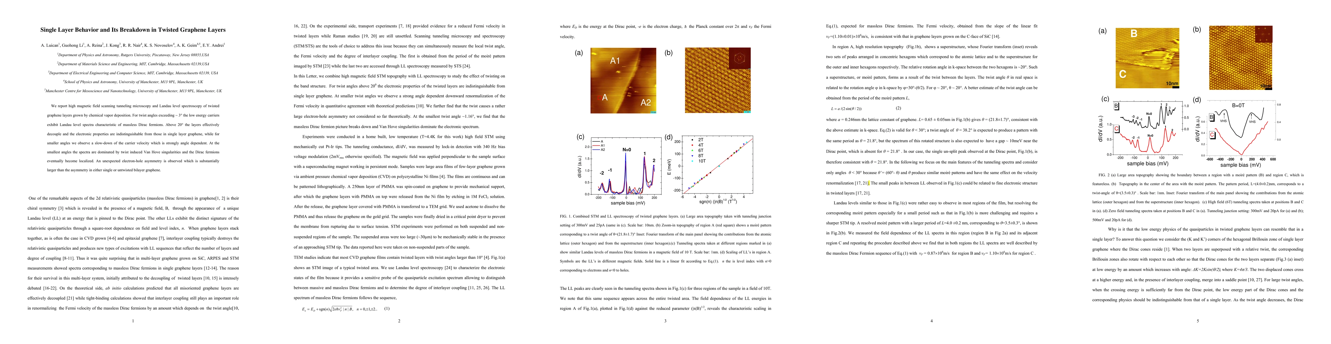 This study investigates twisted graphene layers using high magnetic field scanning techniques, revealing that above 20 degrees twist angle, electronic properties revert to single-layer graphene characteristics, while smaller angles show angle-dependent carrier velocity slowdown and localization of Dirac fermions. An unexpected electron-hole asymmetry larger than in single or untwisted bilayer graphene is also observed.