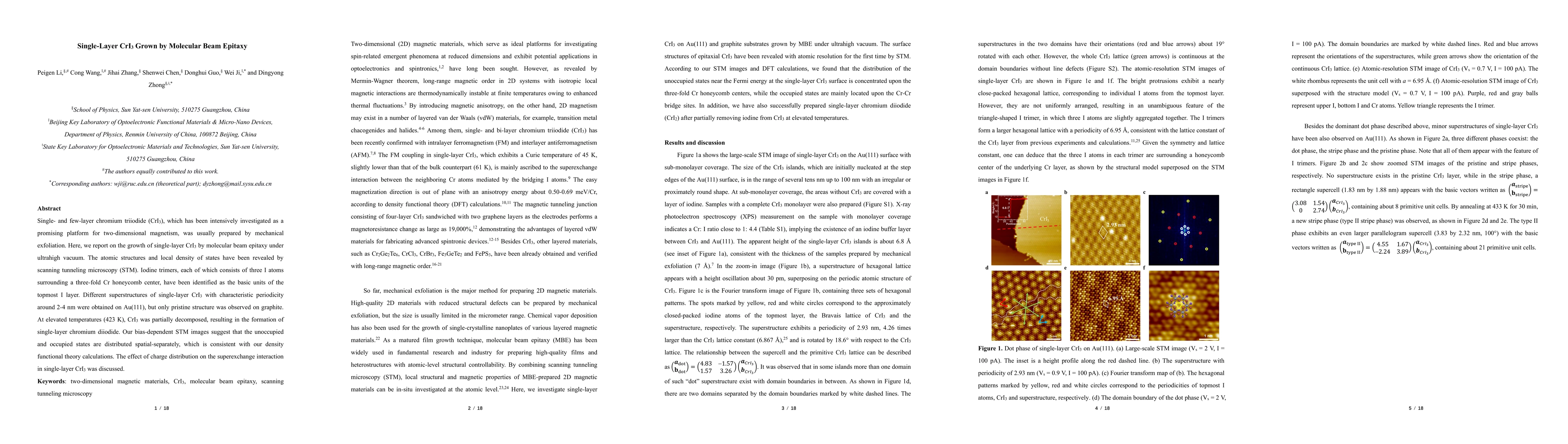 This paper reports the growth of single-layer CrI3 using molecular beam epitaxy, revealing atomic structures via scanning tunneling microscopy and identifying iodine trimers as the basic units. The study discusses the decomposition of CrI3 at elevated temperatures and the spatial separation of charge states, supported by density functional theory calculations.