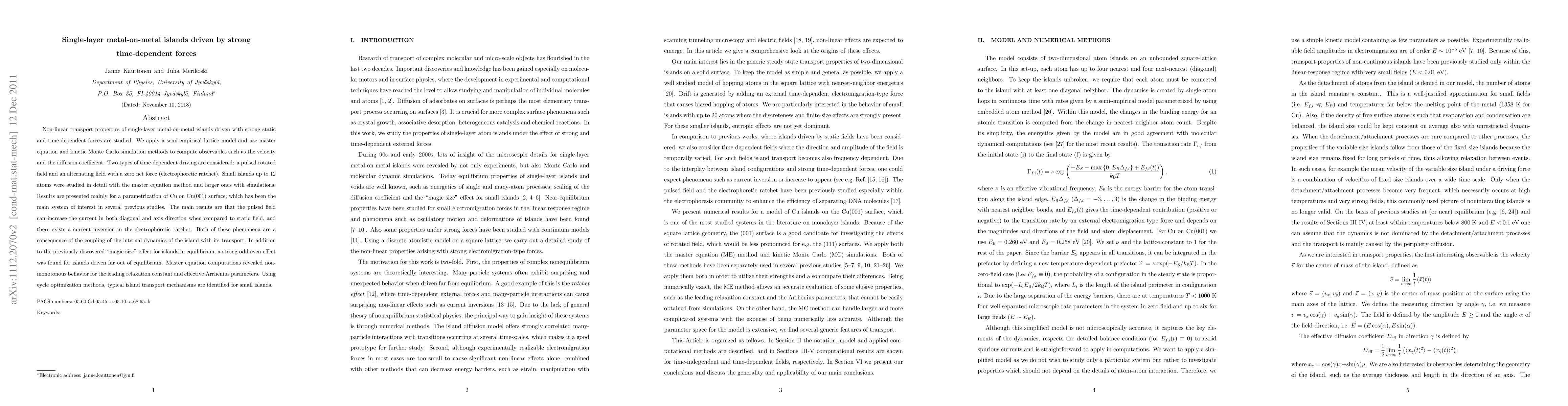 The research employs a semi-empirical model using both continuous-time Monte Carlo (MC) and master equation (ME) methods to study the dynamics of single-layer metal-on-metal islands under strong static and time-dependent forces on a Cu(001) surface.