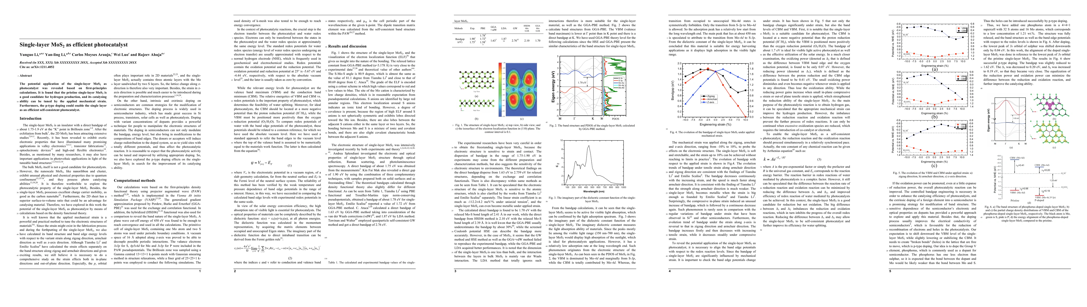 This research reveals that single-layer MoS2 is a promising photocatalyst, with its efficiency tunable via mechanical strain. P-type doping further enhances its performance by enabling direct electron transitions, optimizing reaction sites, and improving light absorption in the visible spectrum.