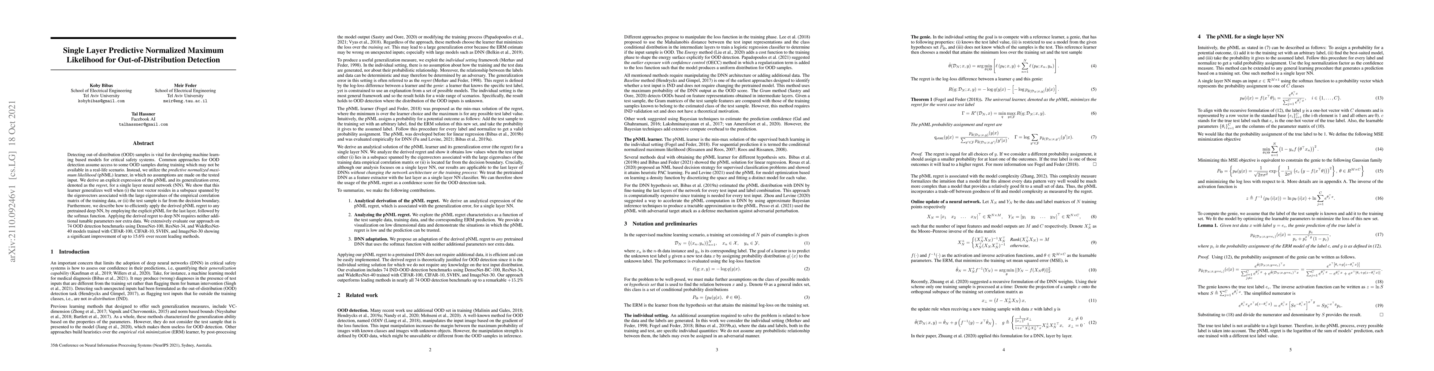 Detecting out-of-distribution (OOD) samples is vital for developing machine learning based models for critical safety systems. Common approaches for OOD detection assume access to some OOD samples during training which may not be available in a real-life scenario. Instead, we utilize the {\em predictive normalized maximum likelihood} (pNML) learner, in which no assumptions are made on the tested input. We derive an explicit expression of the pNML and its generalization error, denoted as the {\em regret}, for a single layer neural network (NN). We show that this learner generalizes well when (i) the test vector resides in a subspace spanned by the eigenvectors associated with the large eigenvalues of the empirical correlation matrix of the training data, or (ii) the test sample is far from the decision boundary. Furthermore, we describe how to efficiently apply the derived pNML regret to any pretrained deep NN, by employing the explicit pNML for the last layer, followed by the softmax function. Applying the derived regret to deep NN requires neither additional tunable parameters nor extra data. We extensively evaluate our approach on 74 OOD detection benchmarks using DenseNet-100, ResNet-34, and WideResNet-40 models trained with CIFAR-100, CIFAR-10, SVHN, and ImageNet-30 showing a significant improvement of up to 15.6\% over recent leading methods.