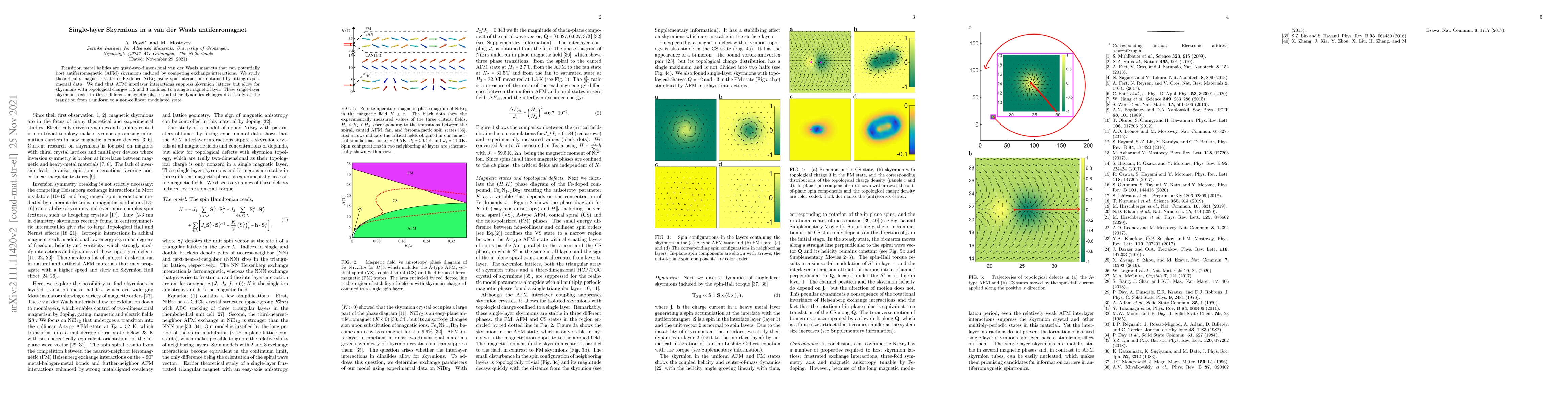 The paper theoretically investigates Fe-doped NiBr$_2$, finding that single-layer skyrmions with topological charges 1, 2, and 3 can form due to AFM interlayer interactions, existing across three magnetic phases with distinct dynamic behaviors.