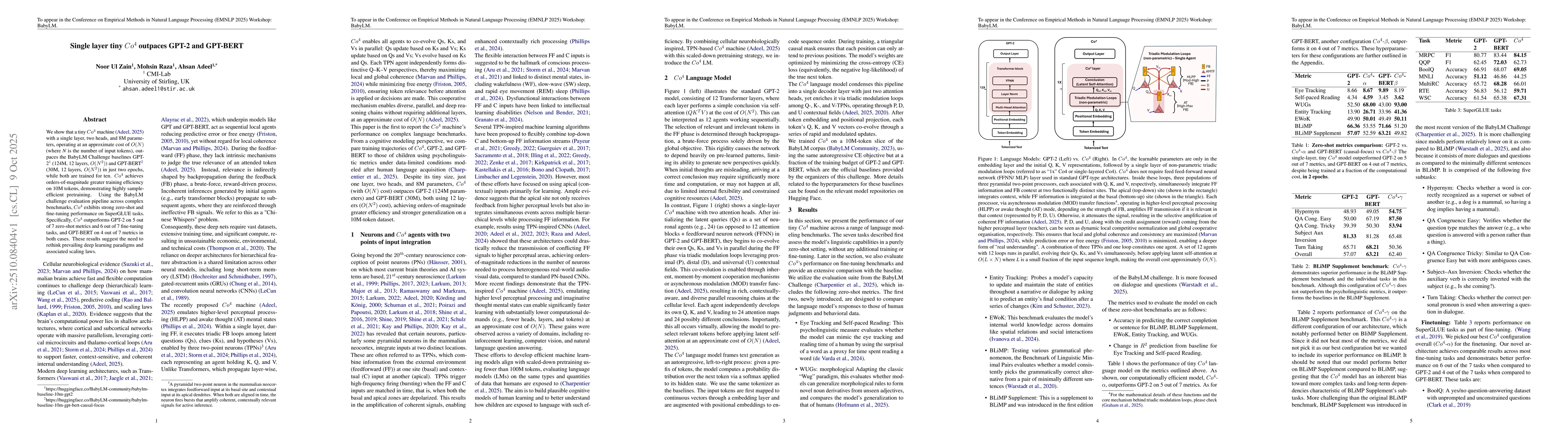 The study introduces a single-layer, tiny Co$^4$ model with 8M parameters, comparing it to GPT-2 (124M) and GPT-BERT (30M) on the BabyLM Challenge benchmarks. The model uses triadic modulation loops without feed-forward layers, achieving O(N) computational complexity.