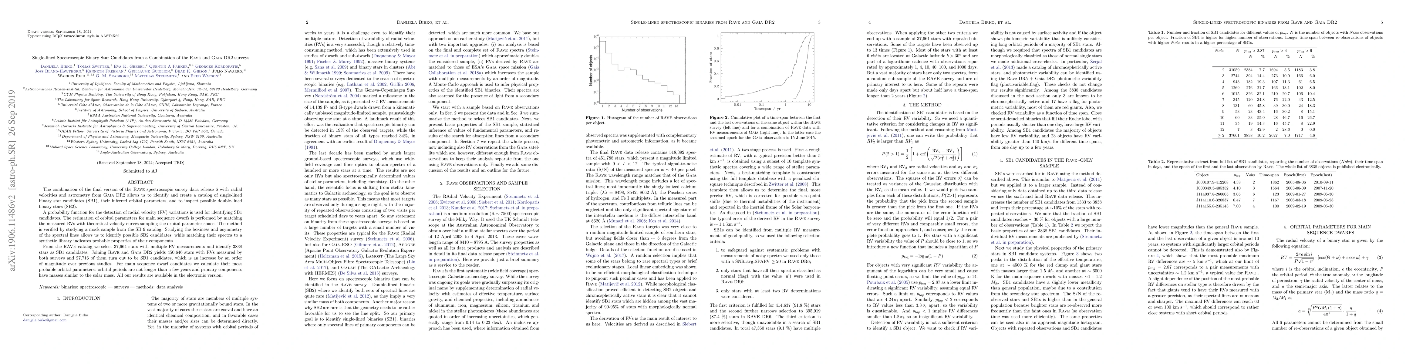 This paper combines RAVE spectroscopic data with Gaia DR2 astrometry to identify and catalog single-lined spectroscopic binary star candidates (SB1), estimating their orbital parameters and detecting possible double-lined binaries (SB2). The study identifies 27,716 SB1 candidates from 450,646 stars, significantly increasing previous detections by an order of magnitude.