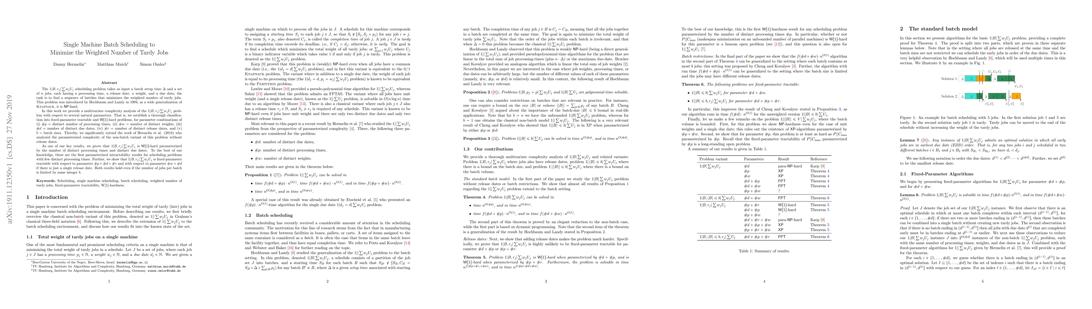 This paper analyzes the complexity of the $1|B,r_j|\sum w_jU_j$ scheduling problem, which aims to minimize the weighted number of tardy jobs under batch setup times. It classifies the problem's complexity with respect to various parameters, proving $W[1]$-hardness for certain combinations and fixed-parameter tractability for others.