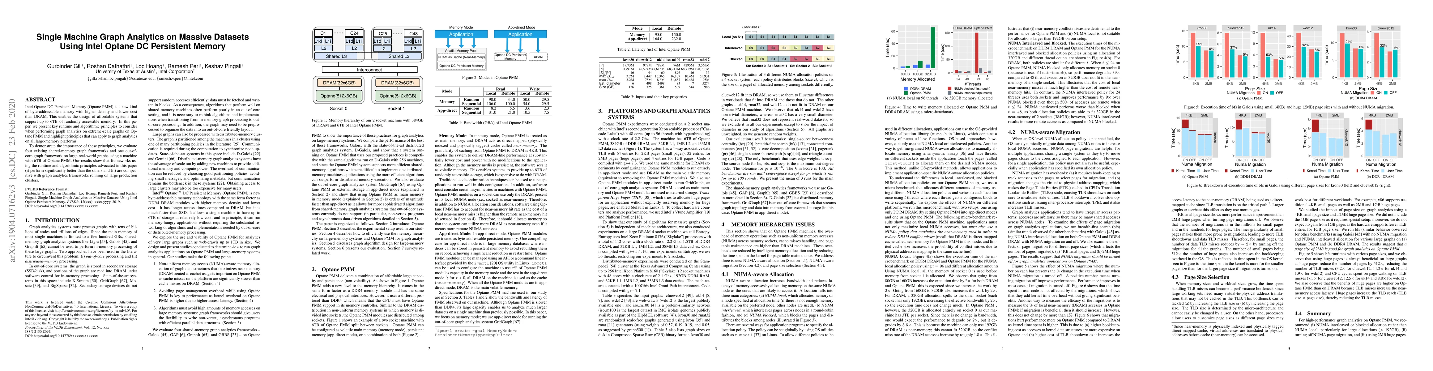 The research evaluates graph analytics on massive datasets using Intel Optane DC Persistent Memory (Optane PMM), a high-capacity, byte-addressable memory technology. It compares the performance of four shared-memory graph frameworks on a 6TB Optane PMM machine against large production clusters.