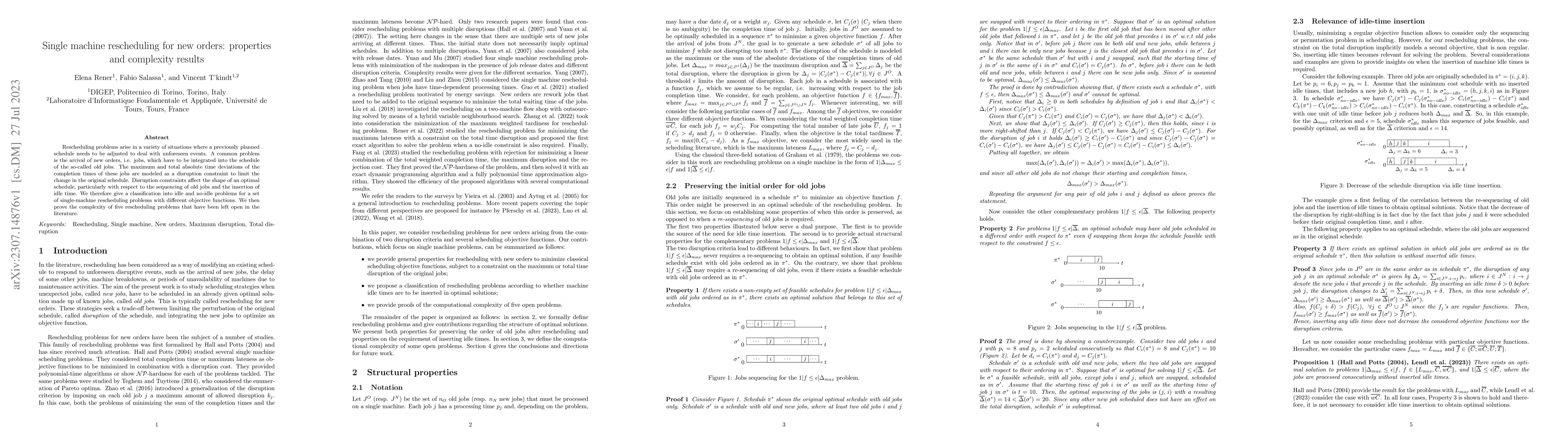 This paper classifies single-machine rescheduling problems with new orders into idle and no-idle scenarios, focusing on the impact of disruption constraints on optimal schedule sequencing. It also proves the complexity of five previously unresolved rescheduling problems.