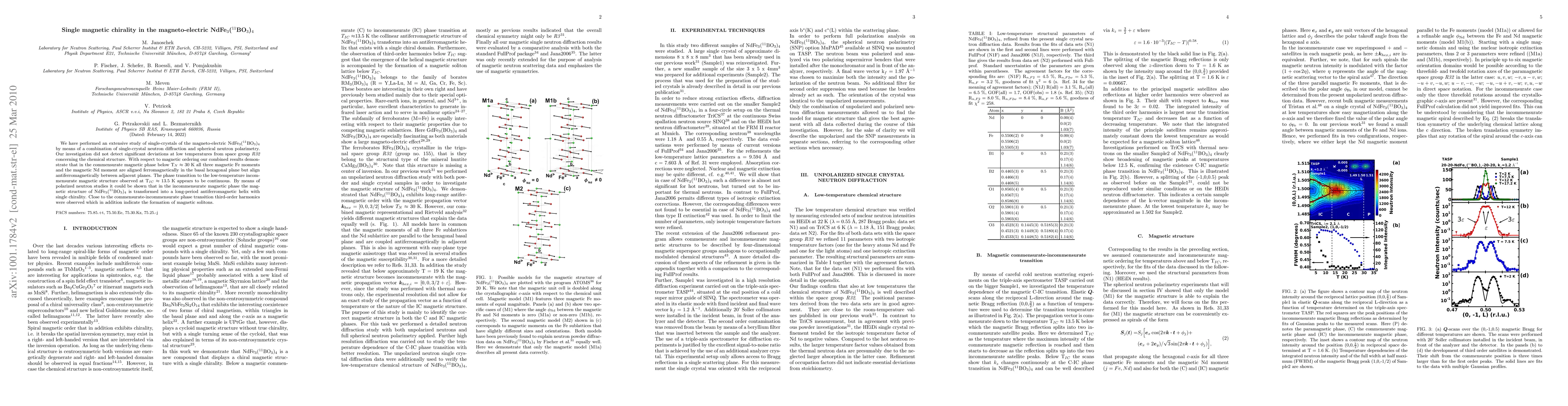 We have performed an extensive study of single-crystals of the magneto-electric NdFe$_3$($^{11}$BO$_3$)$_4$ by means of a combination of single-crystal neutron diffraction and spherical neutron polarimetry. Our investigation did not detect significant deviations at low temperatures from space group R32 concerning the chemical structure. With respect to magnetic ordering our combined results demonstrate that in the commensurate magnetic phase below T$_N$~30 K all three magnetic Fe moments and the magnetic Nd moment are aligned ferromagnetically in the basal hexagonal plane but align antiferromagnetically between adjacent planes. The phase transition to the low-temperature incommensurate magnetic structure observed at T$_{IC}$~13.5 K appears to be continuous. By means of polarized neutron studies it could be shown that in the incommensurate magnetic phase the magnetic structure of NdFe$_3$($^{11}$BO$_3$)$_4$ is transformed into a long-period antiferromagnetic helix with single chirality. Close to the commensurate-incommensurate phase transition third-order harmonics were observed which in addition indicate the formation of magnetic solitons.