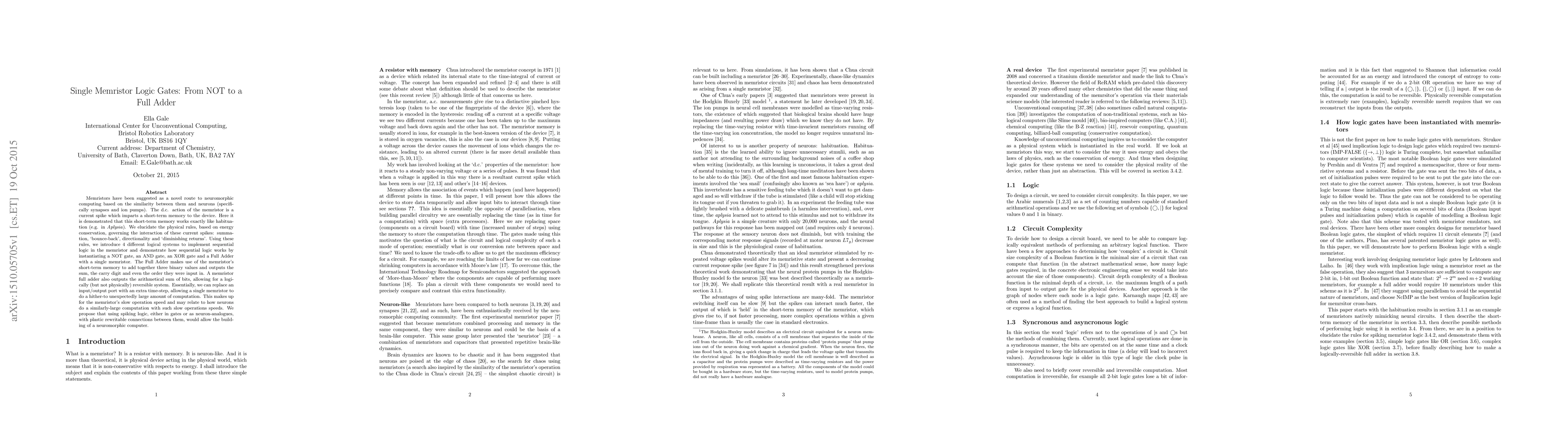 This paper demonstrates the potential of memristors to implement various logic gates and a full adder using their short-term memory capabilities. The memristor's ability to store and process current spikes allows for complex computations, suggesting a new direction for neuromorphic computing.