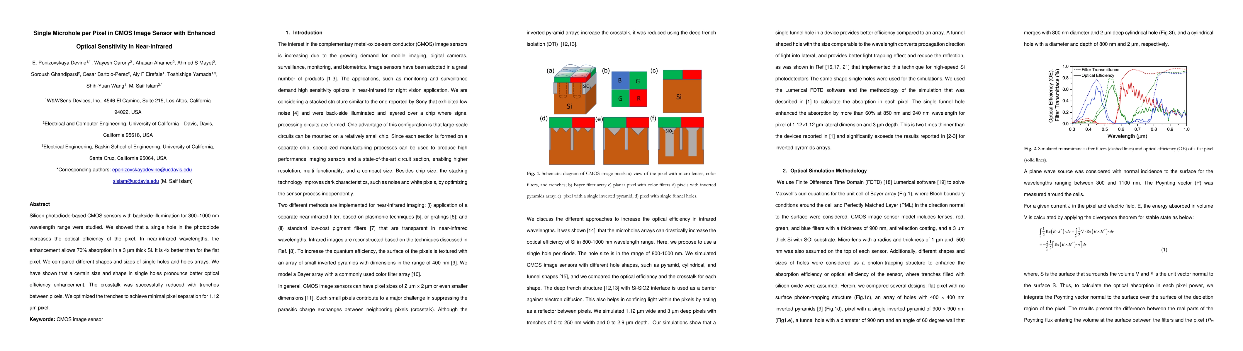 A study found that adding a single hole to a CMOS image sensor increases its optical sensitivity in near-infrared wavelengths, allowing for 70% absorption in a 3-micron thick Si layer, outperforming flat pixels.