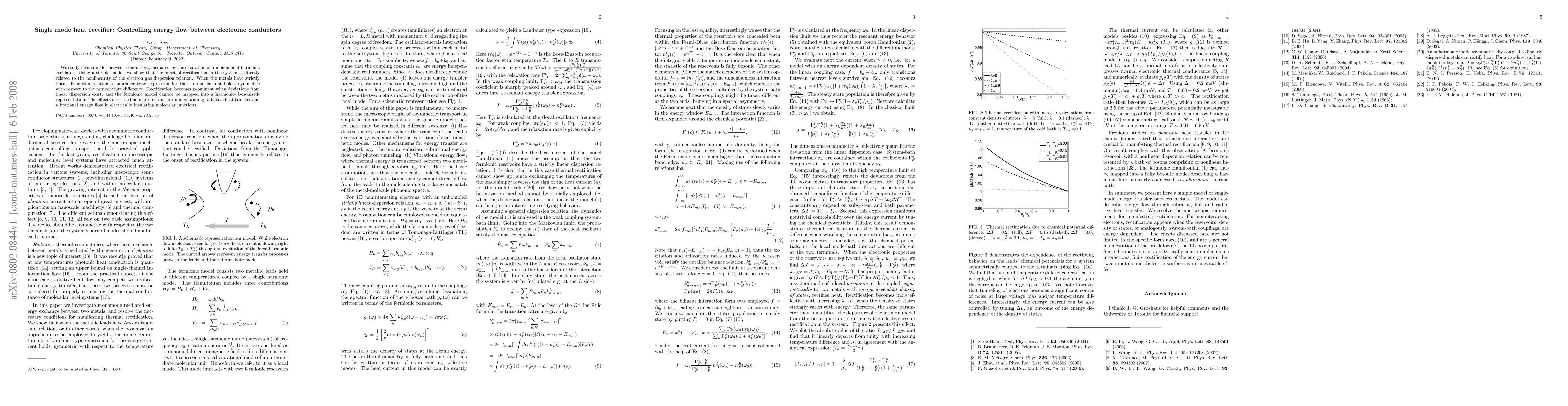 We study heat transfer between conductors, mediated by the excitation of a monomodal harmonic oscillator. Using a simple model, we show that the onset of rectification in the system is directly related to the nonlinearity of the electron gas dispersion relation. When the metals have strictly linear dispersion relation a Landauer type expression for the thermal current holds, symmetric with respect to the temperature difference. Rectification becomes prominent when deviations from linear dispersion exist, and the fermionic model cannot be mapped into a harmonic- bosonized- representation. The effects described here are relevant for understanding radiative heat transfer and vibrational energy flow in electrically insulating molecular junctions.